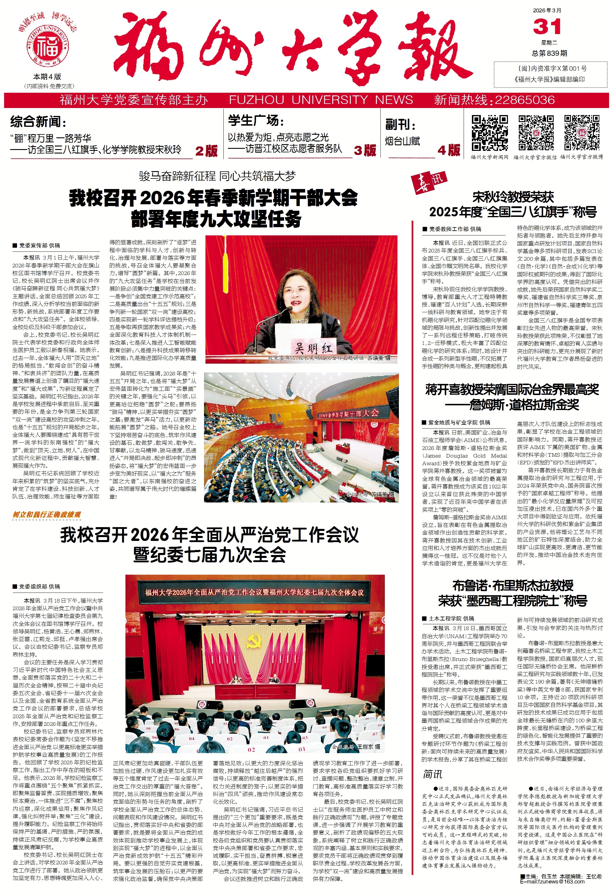 融媒中心讯/3月1日上午,福州大学2026年春季新学期干部大会在旗山校区图书馆博学厅召开。校党委书记、校长吴明红院士出席会议并作《骏马奋蹄新征程同心共筑福大梦》主题讲话,全面总结回顾2025年工作成绩,深入分析学校当前面临的新形势、新挑战,系统部署年度工作要点和“九大攻坚任务”。全体校领导、全校处级及科级干部参加会议。会上,校党委书记、校长吴明红院士代表学校党委和行政向全体师生医护员工致以新春祝福。她表...
