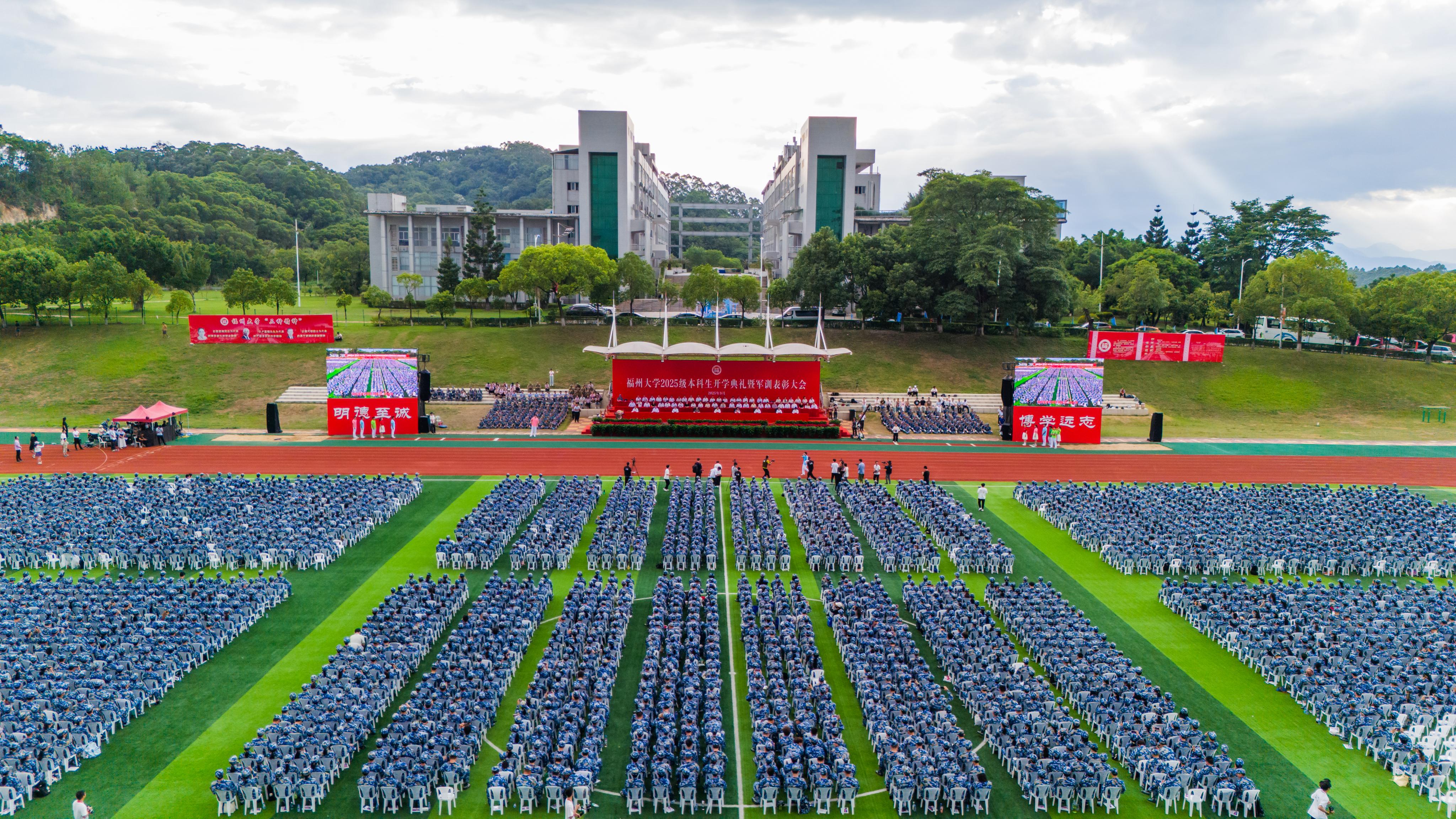 融媒中心讯/秋阳烁金,军魂铸志,旌旗招展,青春昂扬。9月21日,福州大学2025级本科生开学典礼暨军训表彰大会在铜盘校区田径场举行。校领导陈国龙、吴明红、王向阳、杨黄浩、郑煦林、张亚雷、江莉龙、邱挺出席典礼,校友代表、1985级电力系统及其自动化专业毕业生、恒锋信息科技股份有限公司董事长魏晓曦受邀出席。学校相关部处及各学院负责人、教师代表,承训部队全体官兵,2025级全体本科新生及新生辅导员参加典礼。典礼由校...