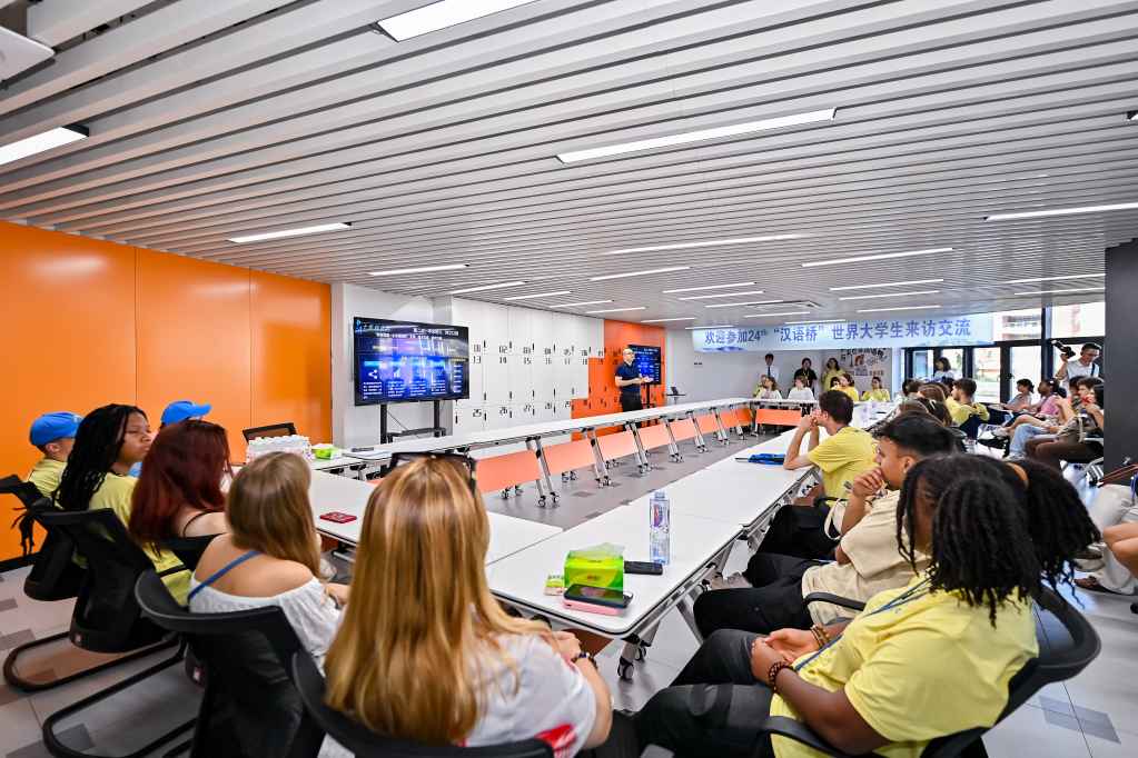 在先进技术控制中心,当智能喷绘设备高效运转,从指令下达到产品包装一气呵成,印有“福大”与“汉语桥”标识的主题徽章随即产出,科技赋能产业的美好愿景在每位选手眼前跃然呈现。在数字中国研究院(福建)展馆内,展板图文与电子屏幕交织描绘着城市治理的清晰脉络。通过细致介绍,选手们对中国的数字化治理有了新的认识。除了沉浸式的观看体验,“汉语桥”的选手们在与创业校友和学生代表的分享交流中,进一步感受了中国青年投身科技创新的无限热情,也从中汲取到了追梦的力量与灵感。