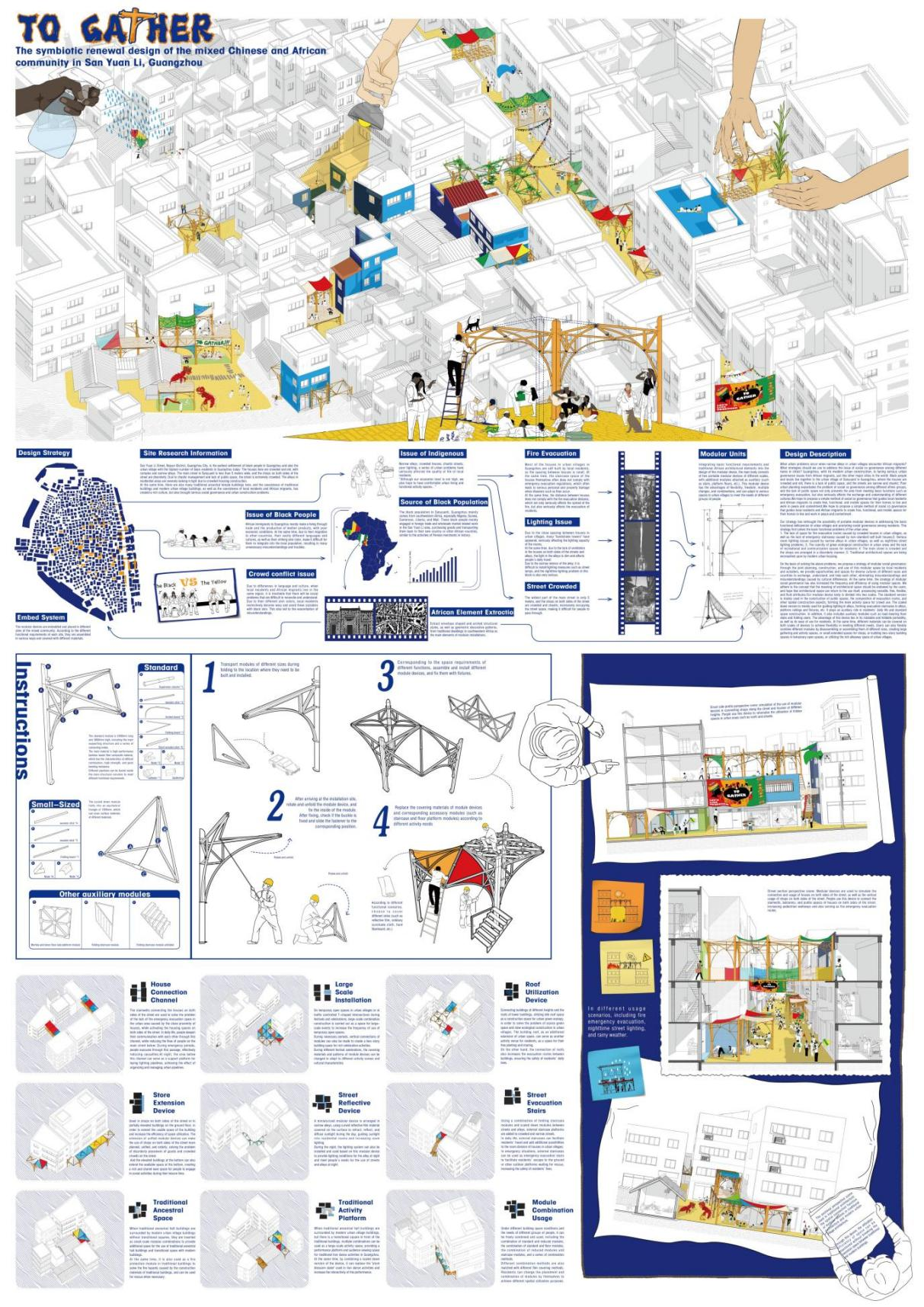 蔡安琪同学的设计作品《To Gather》(指导教师:杨元传、林志森、吴志刚),探讨了广州三元里中非混合社区的共生式微更新设计。作为历史积淀深厚的中非混居社区,广州三元里有多方面城市问题亟需改善,如居住安全隐患与空间利用、社会治理与治安管理挑战、经济生态脆弱性,以及文化交流与公共服务等。该作品的设计提出一个自下而上促进多元文化融合共生的空间赋能策略,以一套低成本、易拆装的模块化装置驱动,依托灵活多变的物理载体挖掘空间潜力,进而激活社区内生动力。