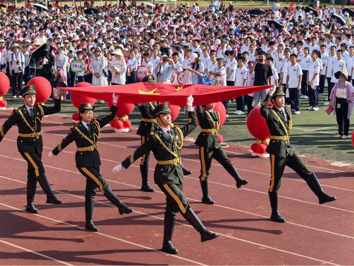 伴随着雄壮的国歌,国旗护卫队迈着整齐划一的步伐,圆满完成出旗仪式。五星红旗冉冉升起,全体在场人员肃立,面向国旗行注目礼。