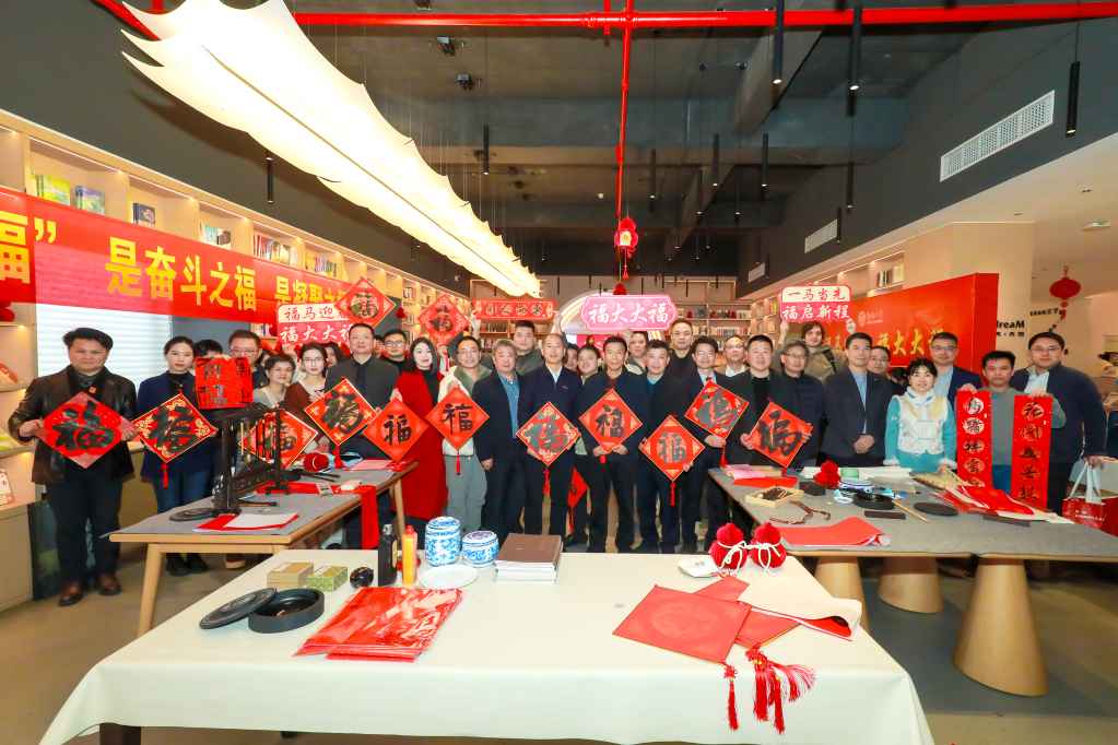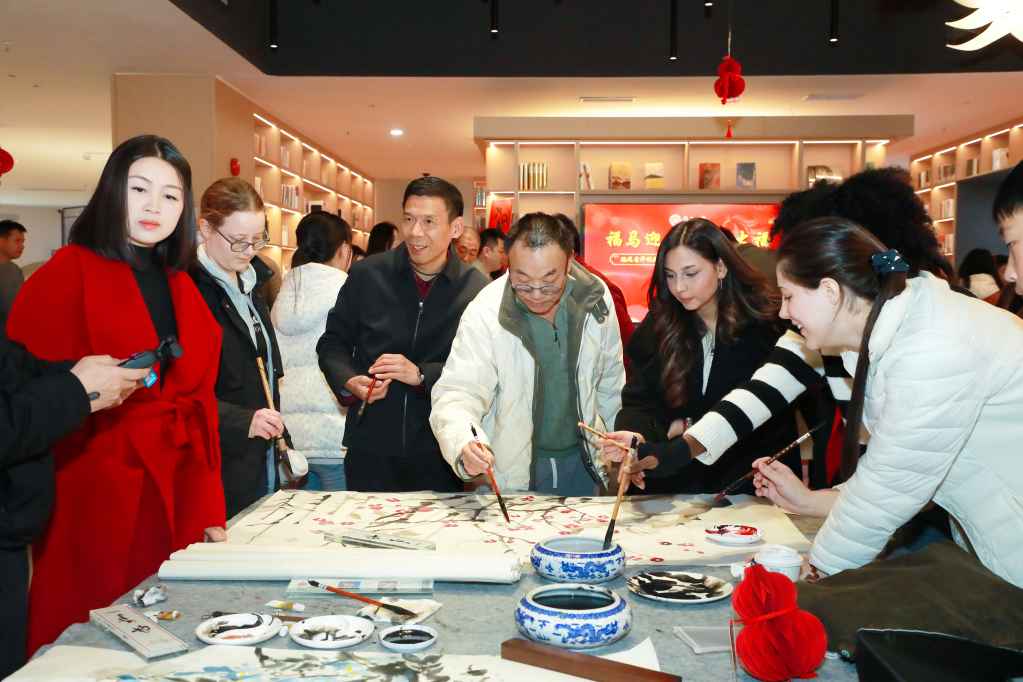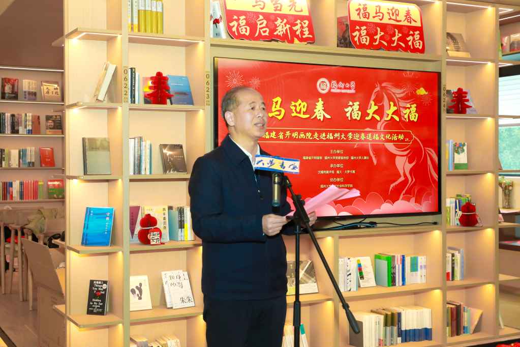 融媒中心讯/福启新岁,墨润旗园。为进一步弘扬中华传统节庆文化,1月29日,“福马迎春·福大大福”福建省开明画院走进福州大学迎春送福文化活动在福大·大梦书屋举行。校党委副书记王向阳出席活动。福建省开明画院艺术家代表、福州大学优秀专家人才代表与留学生共同参加活动。活动由校党委宣传部负责人主持。