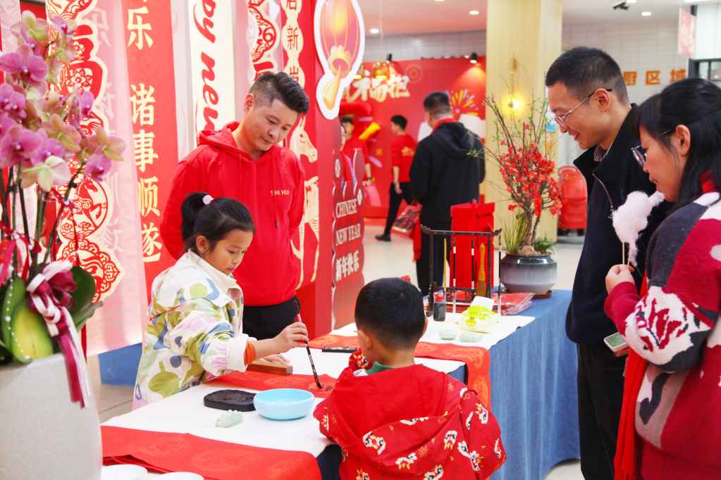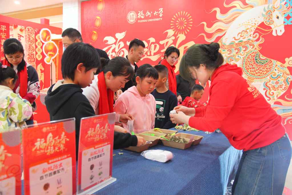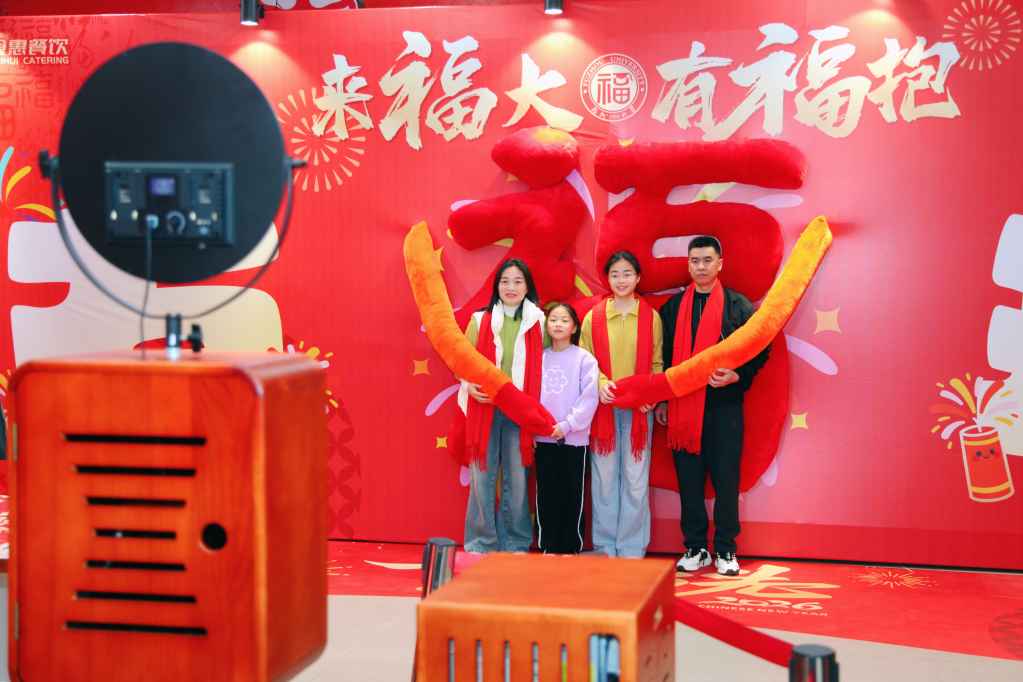 年夜饭开始前,活动现场还举办了新春游园会。今年的活动在延续往年互动的基础上,以“福马迎春福大年”为主题,着重融入马年文化元素,让参与者充分感受传统文化魅力。餐厅悬挂红灯笼与中国结,并以剪纸“奔腾骏马”、书画“马到成功”点缀空间,设置了“来福大 有福抱”“香囊手作”“春联剪纸”“年味集市”等环节,融合了地方传统与马年吉祥寓意,吸引众多教职工和家属打卡点赞。