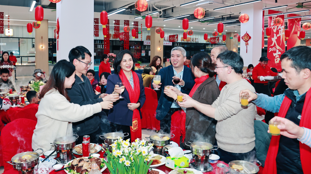 融媒中心讯/农历丙午马年新春将至,福州大学校园内洋溢着欢乐祥和的节日氛围。学校延续温暖传统,2月15日晚,在旗山校区玫瑰园餐厅举办迎新春年夜饭活动。校党委书记、校长吴明红院士,校党委副书记王向阳,副校长邱挺,相关职能部门负责人,留校教职工,一线值守人员及家属等近百人欢聚一堂,同庆马年新春,共话美好未来。活动由王向阳副书记主持。