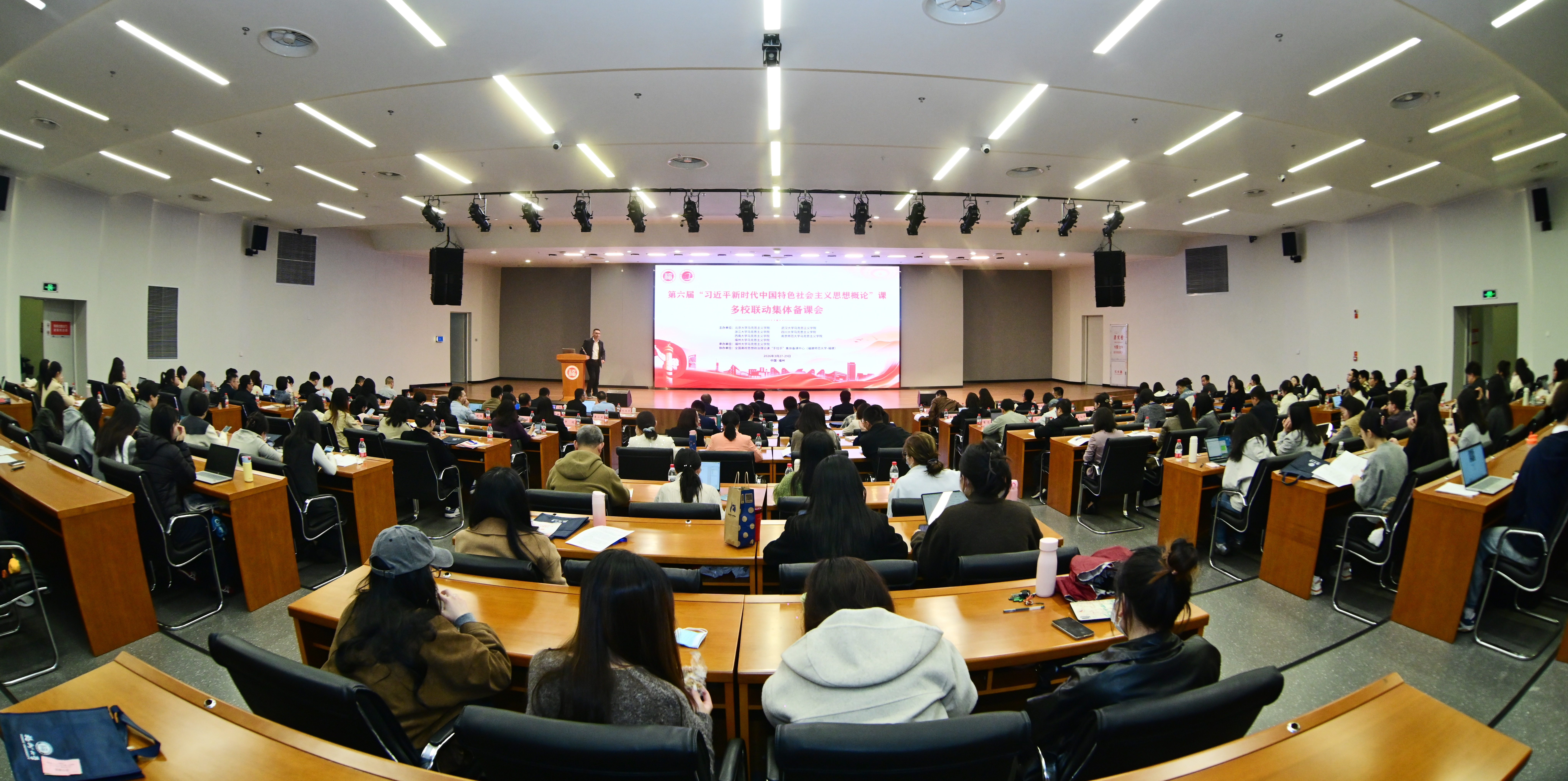 会议开幕式在福州大学旗山校区晋江楼一楼报告厅举行,由福州大学马克思主义学院负责人主持。福州大学党委常委、副校长杨黄浩教授出席开幕式并致辞,他指出,“习近平新时代中国特色社会主义思想概论”课是落实立德树人根本任务的关键课程之一,肩负着传播党的创新理论、培育时代新人的重要使命。本次多校联动集体备课会的召开,既是对思政课教学改革成果的交流展示,更是对新时代思政课高质量发展的探索谋划。各院校应以本次备课会为契机,持续深化交流合作,共享优质教学资源,共解教学实践难题,推动“习近平新时代中国特色社会主义思想概论”课课程教学水平再上新台阶。