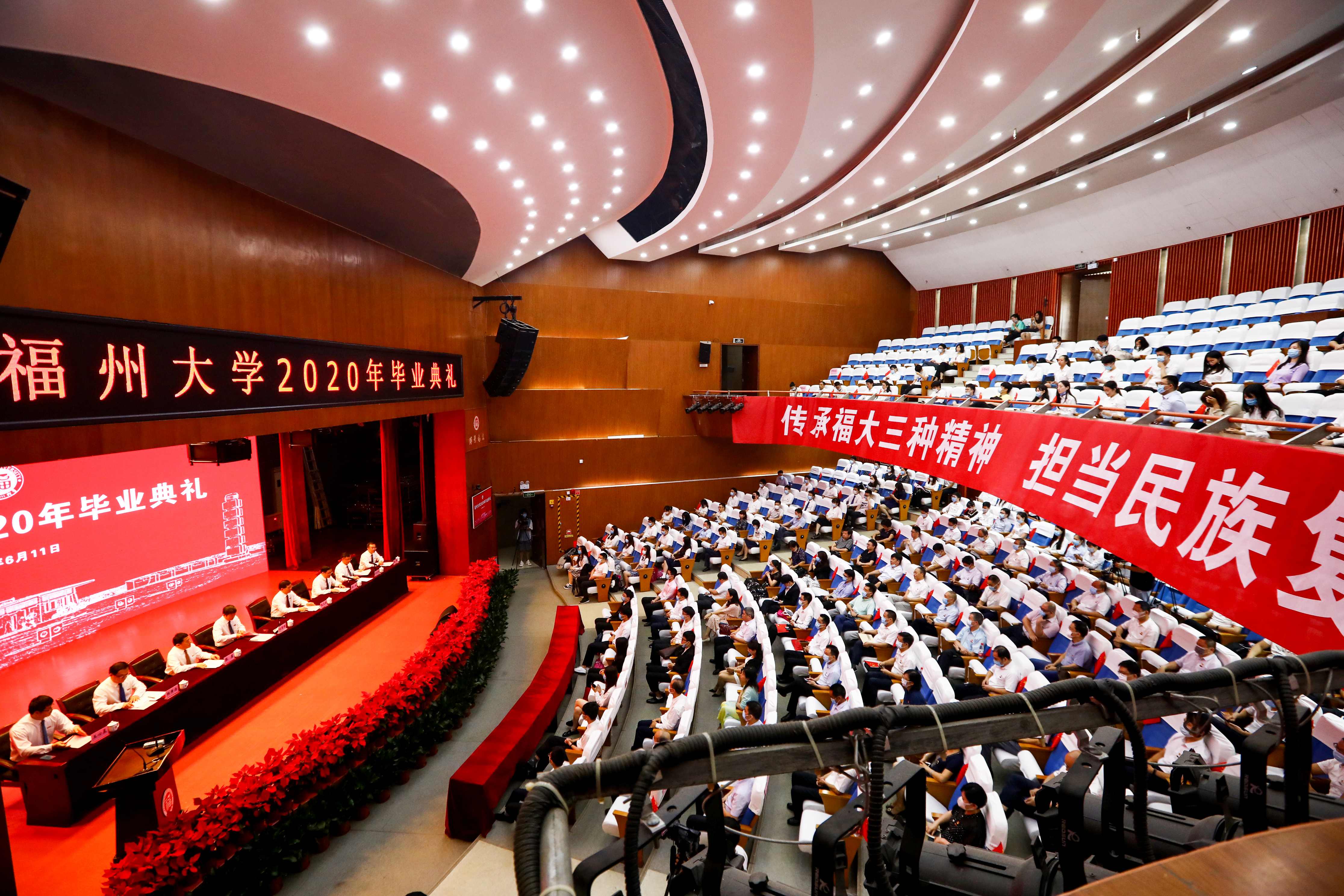 新闻中心讯/6月11日上午,福州大学2020年毕业典礼在图书馆举行。受新冠肺炎疫情影响,福州大学首次在网上举办毕业典礼,典礼采取“线上+线下”模式。部分毕业生代表在现场参加典礼仪式,其余毕业生通过现场直播的方式进行“云典礼”。