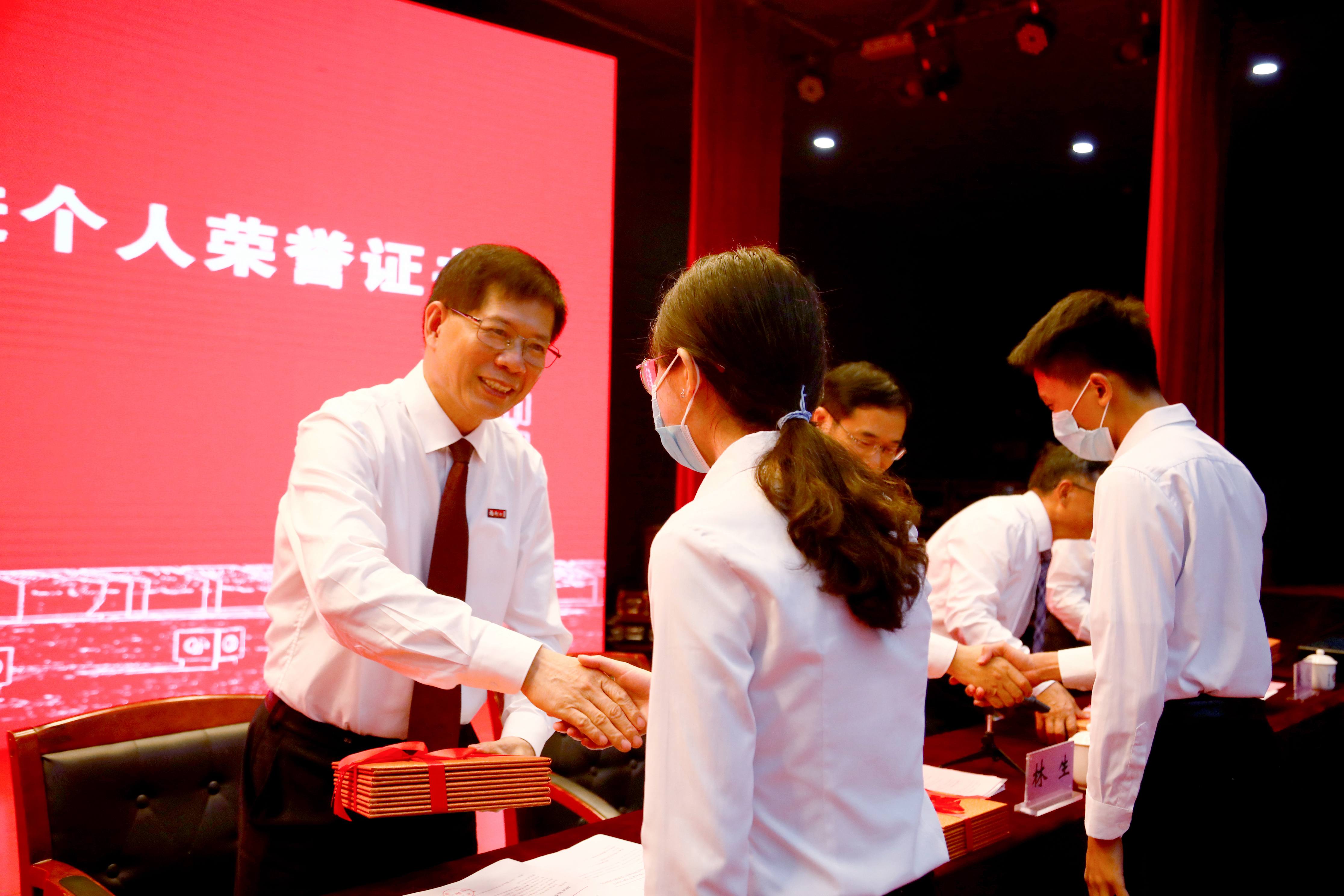 校党委张天明书记等校领导为优秀毕业生、考研升学先进个人代表颁发荣誉证书 蓝苗摄