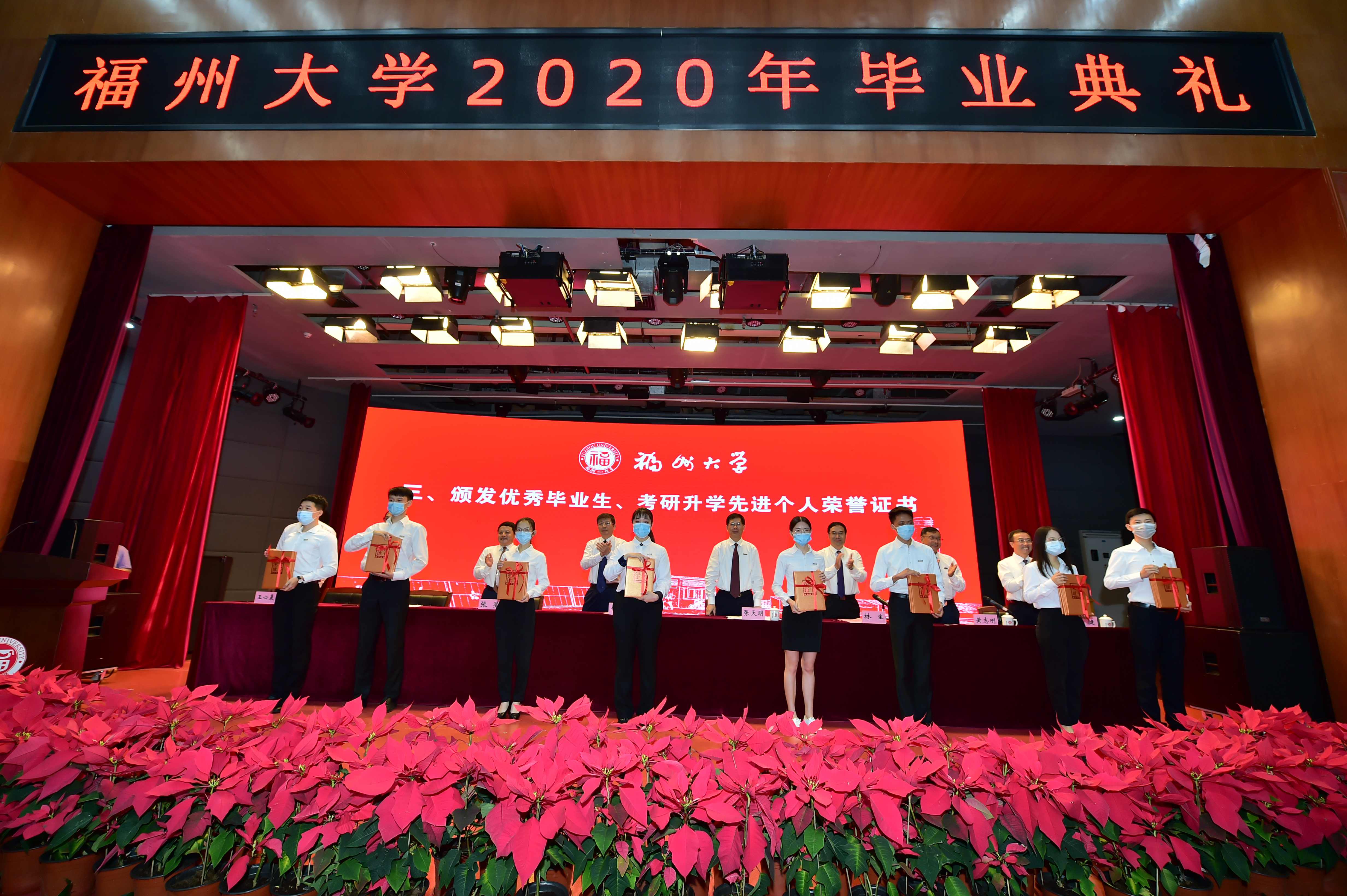 毕业典礼在雄壮的国歌声中拉开帷幕。黄志刚副校长宣读《关于授予蔡永武等420位同学“福州大学2020届优秀毕业生”荣誉称号的决定》《福州大学关于表彰2020届本科毕业生升学先进个人的决定》。校领导依次为2020届优秀毕业生、考研升学先进个人代表颁发荣誉证书。