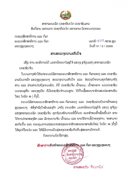 老挝琅勃拉邦省教育体育厅发来慰问信,鼓励福州大学抗疫工作