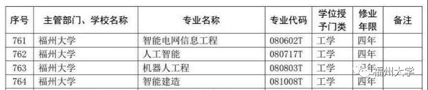 本年度各高校新增备案专业1672个、审批专业181个(含130个国家控制布点专业和51个目录外新专业),调整学位授予门类或修业年限专业47个,撤销专业367个。此次,福州大学获批新增4个与人工智能技术和应用密切相关的专业,分别是智能电网信息工程、人工智能、机器人工程、智能建造。目前,包括新增4个专业,福州大学本科专业总数达88个。