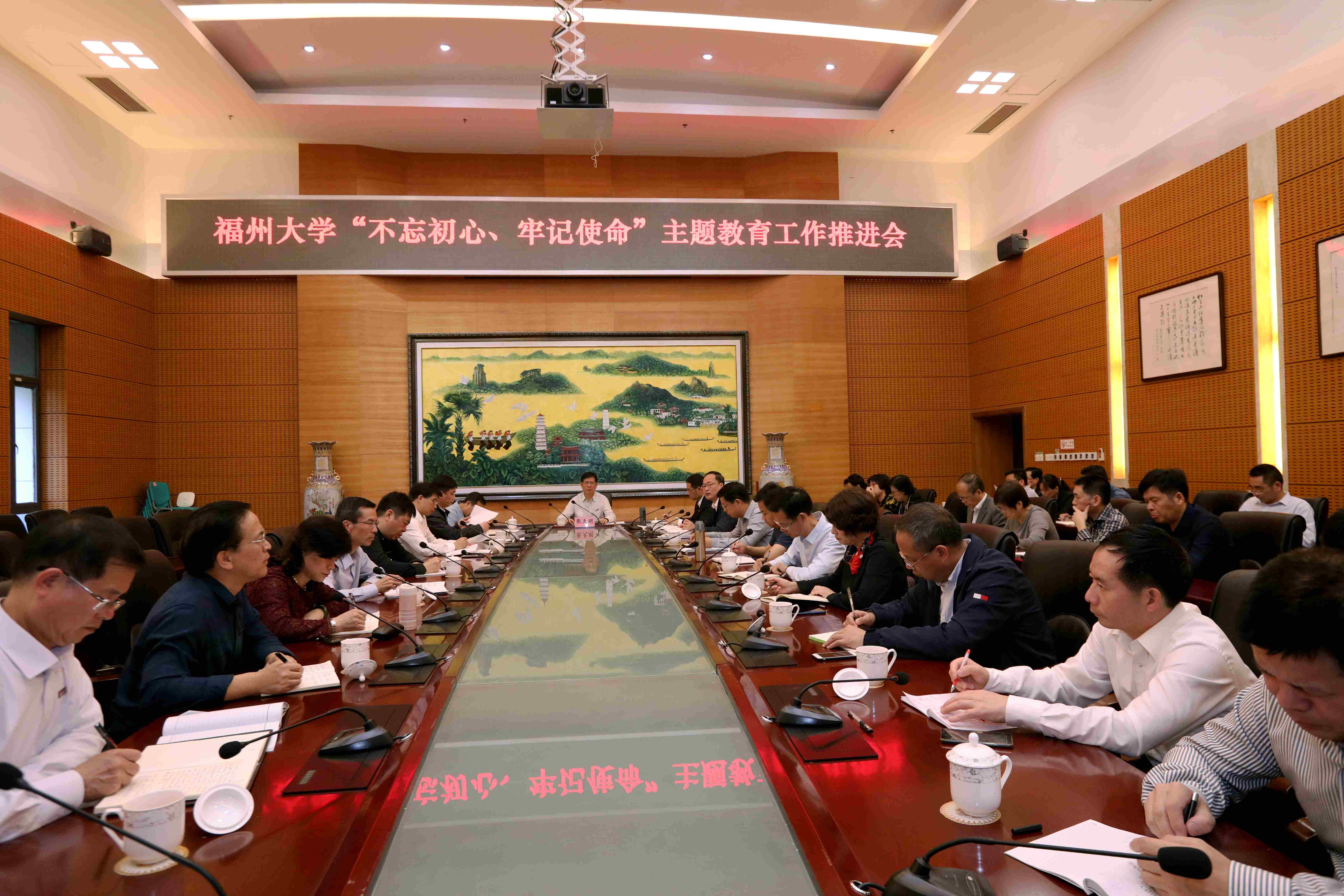 新闻中心讯/11月24日上午,福州大学在旗山校区南楼123会议室召开 “不忘初心、牢记使命”主题教育推进会,校党委张天明书记、林生副书记、各二级党委书记、校主题教育领导小组办公室下设的五个工作组和校内指导督导组全体成员参会,会议由林生副书记主持。
