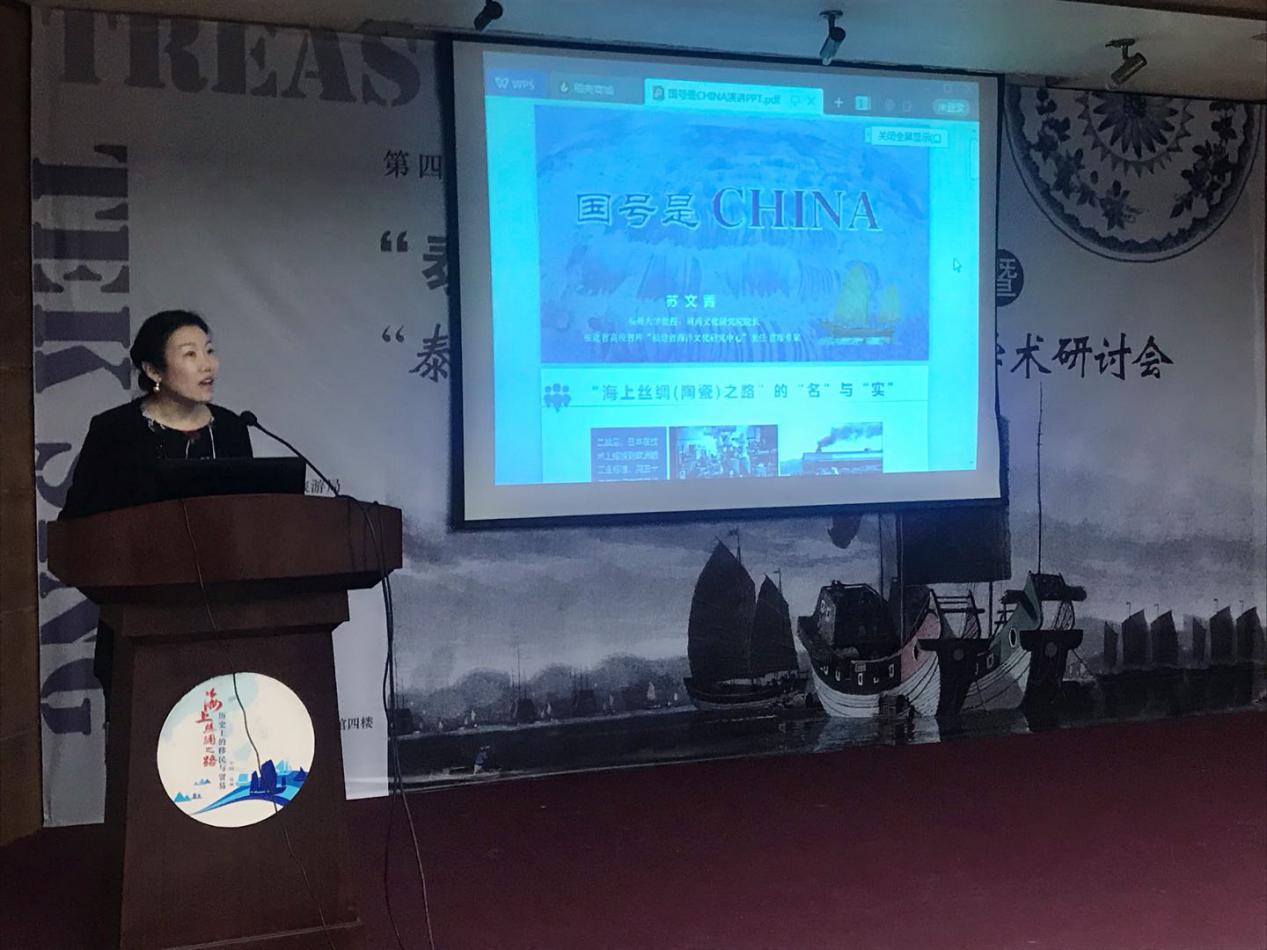 新闻中心讯/11月28日,作为第四届海上丝绸之路国际艺术节全域性活动项目之一, “泰兴号”瓷器捐赠仪式暨“泰兴号”与古代陶瓷之路学术研讨会在泉州海外交通史博物馆举行。来自省内外20多个专家学者欢聚泉州,围绕古代陶瓷之路展开专题学术交流。福大智库专家苏文菁应邀出席活动并作“国号是CHINA”专题演讲。