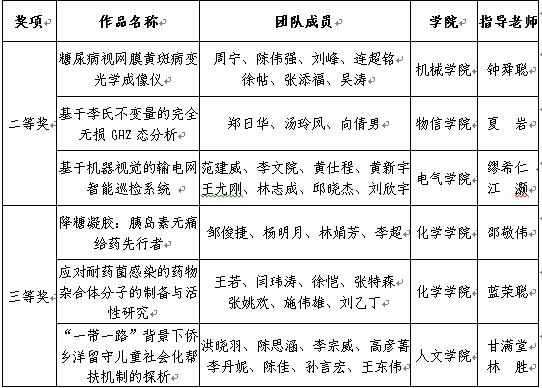 “糖尿病视网膜黄斑病变光学成像仪”(机械学院,指导老师:钟舜聪)、“基于李氏不变量的完全无损GHZ态分析”(物信学院,指导老师:夏岩)和“基于机器视觉的输电网智能巡检系统”(电气学院,指导老师:缪希仁、江灏)获二等奖。“降糖凝胶:胰岛素无痛给药先行者”(化学学院,指导老师:邵敬伟)、“应对耐药菌感染的药物杂合体分子的制备与活性研究”(化学学院,指导老师:蓝荣聪)和“‘一带一路’背景下侨乡洋留守儿童社会化帮扶机制的探析”(人文学院,指导老师:甘满堂、林胜)获三等奖。