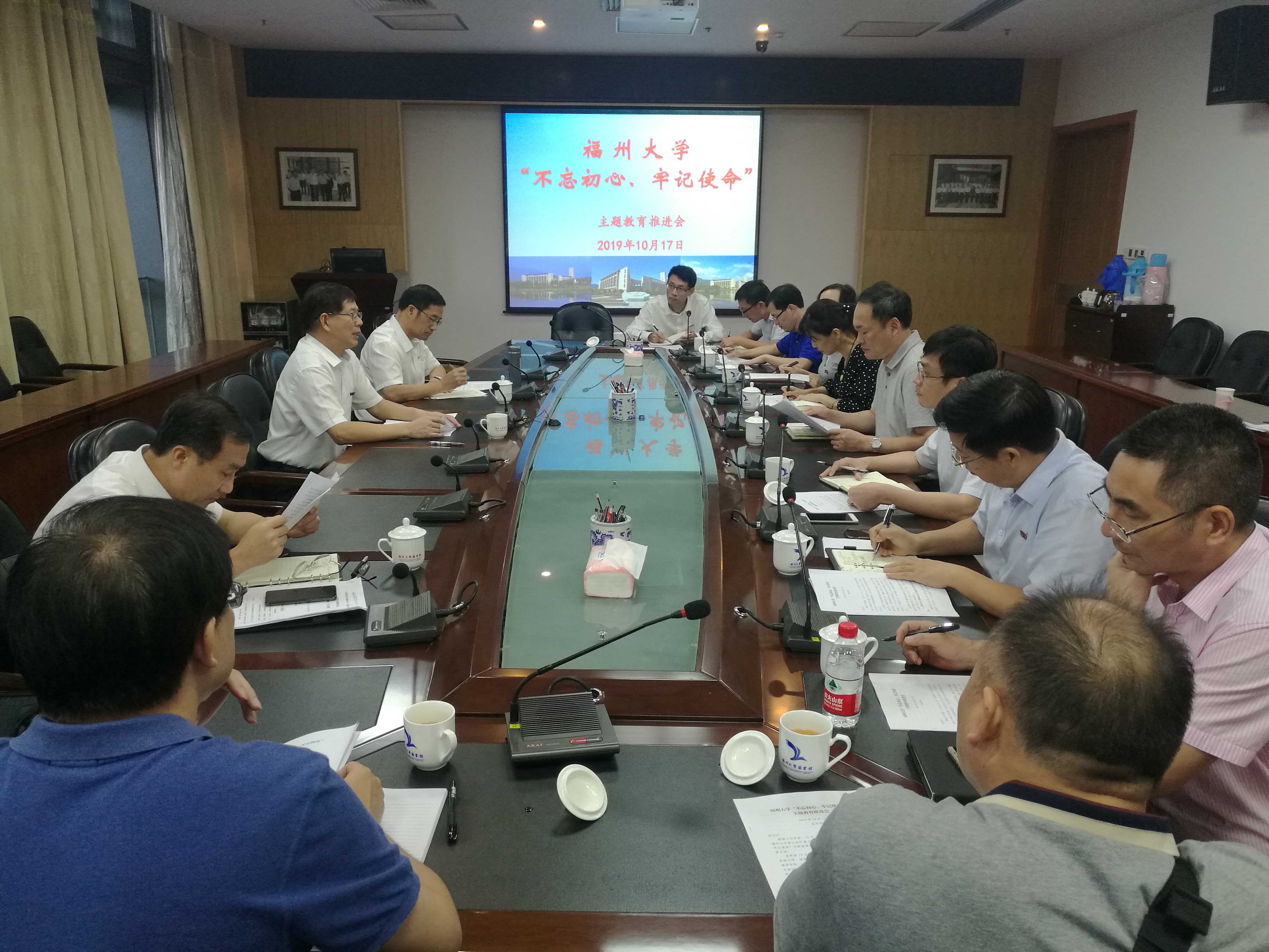 新闻中心讯/10月17日下午,福州大学在旗山校区图书馆四楼会议室召开“不忘初心、牢记使命”主题教育专题会议。学校“不忘初心、牢记使命”主题教育领导小组组长、校党委书记张天明,领导小组副组长兼办公室主任、校党委副书记林生,以及主题教育领导小组办公室下设的五个工作组全体成员参加了会议。