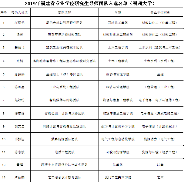 新闻中心讯/近日,福建省学位委员会公布了“2019年省级专业学位研究生导师团队建设名单”,福州大学江莉龙导师为带头人的“氨的合成与利用研究团队”等13个团队获批。
