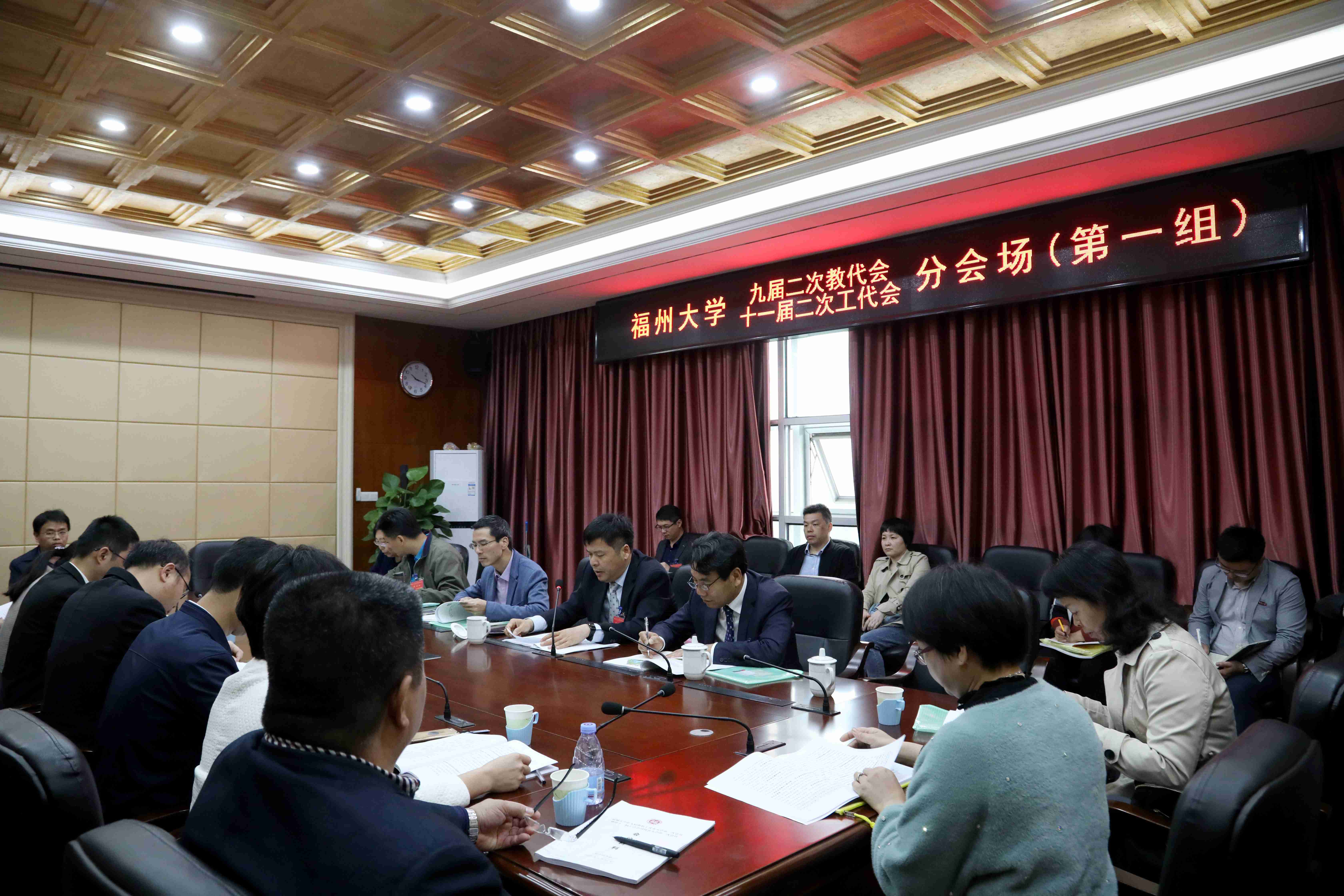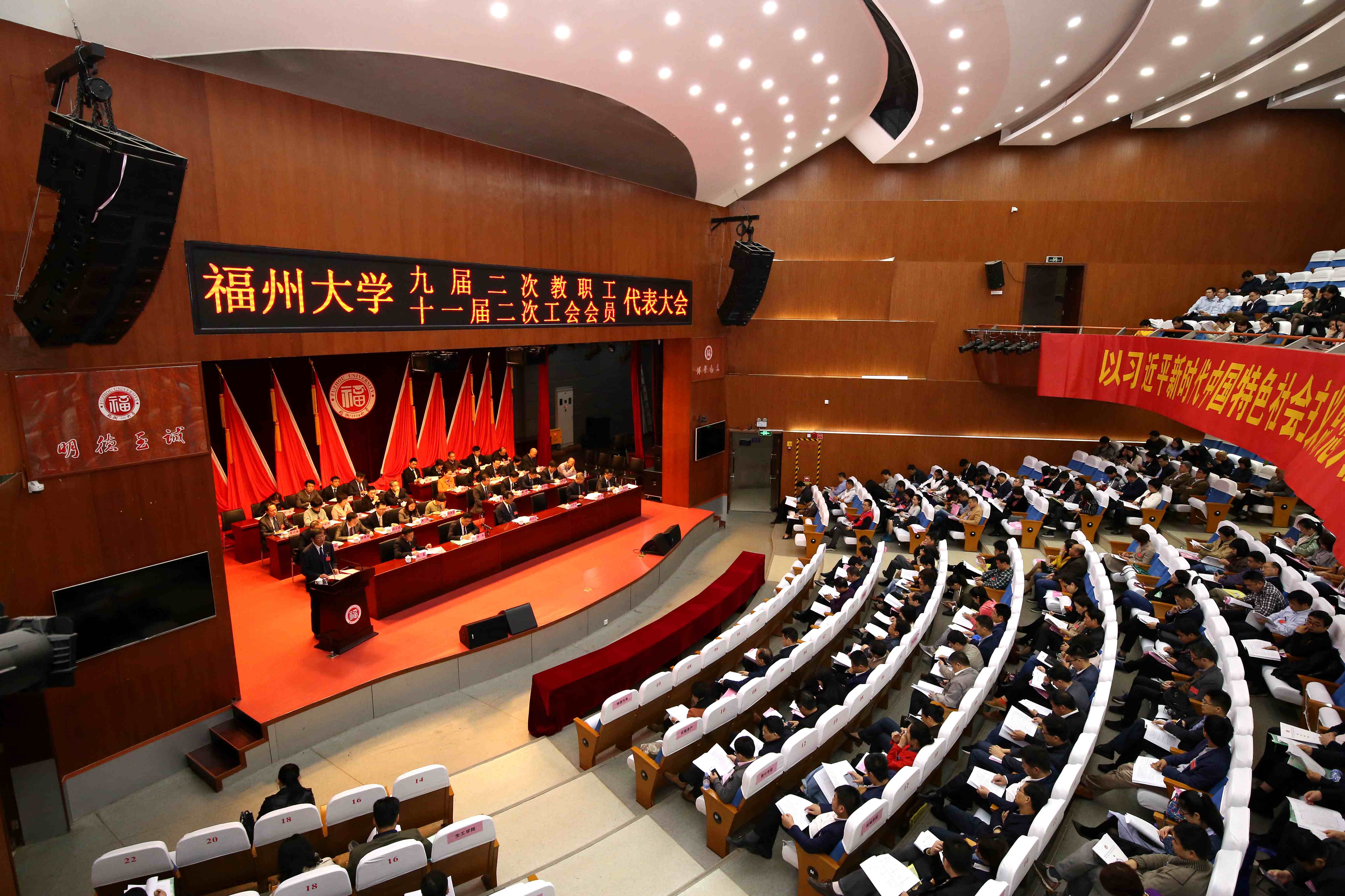 新闻中心讯/4月11日,福州大学第九届教职工代表大会第二次会议暨第十一届工会会员代表大会第二次会议在旗山校区图书馆举行,大会以习近平新时代中国特色社会主义思想为指导,加快建成世界一流的东南强校。校领导陈永正、付贤智、林生、邹毅、张星、黄志刚出席会议,全体正式代表、特邀代表和列席代表近300人参加会议。