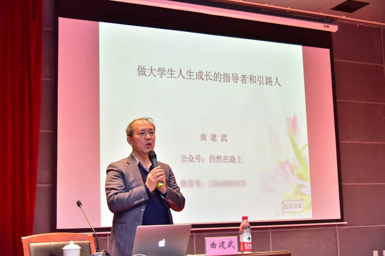 曲教授从36年前留校担任辅导员讲起,结合自己丰富的思想政治工作经历,通过大量的工作实例,深刻阐释了辅导员工作的重要意义,指明了辅导员队伍的发展方向。曲教授强调,辅导员要有坚定的共产主义信仰,要热爱祖国、热爱人民、热爱学生,要有思想、有情怀、有格局,要把思想政治教育作为工作核心,要用真心、爱心去对待每一个学生,通过言传身教,做学生的人生导师和价值标杆,并结合实例诠释了习近平总书记对青年人的四点希望。