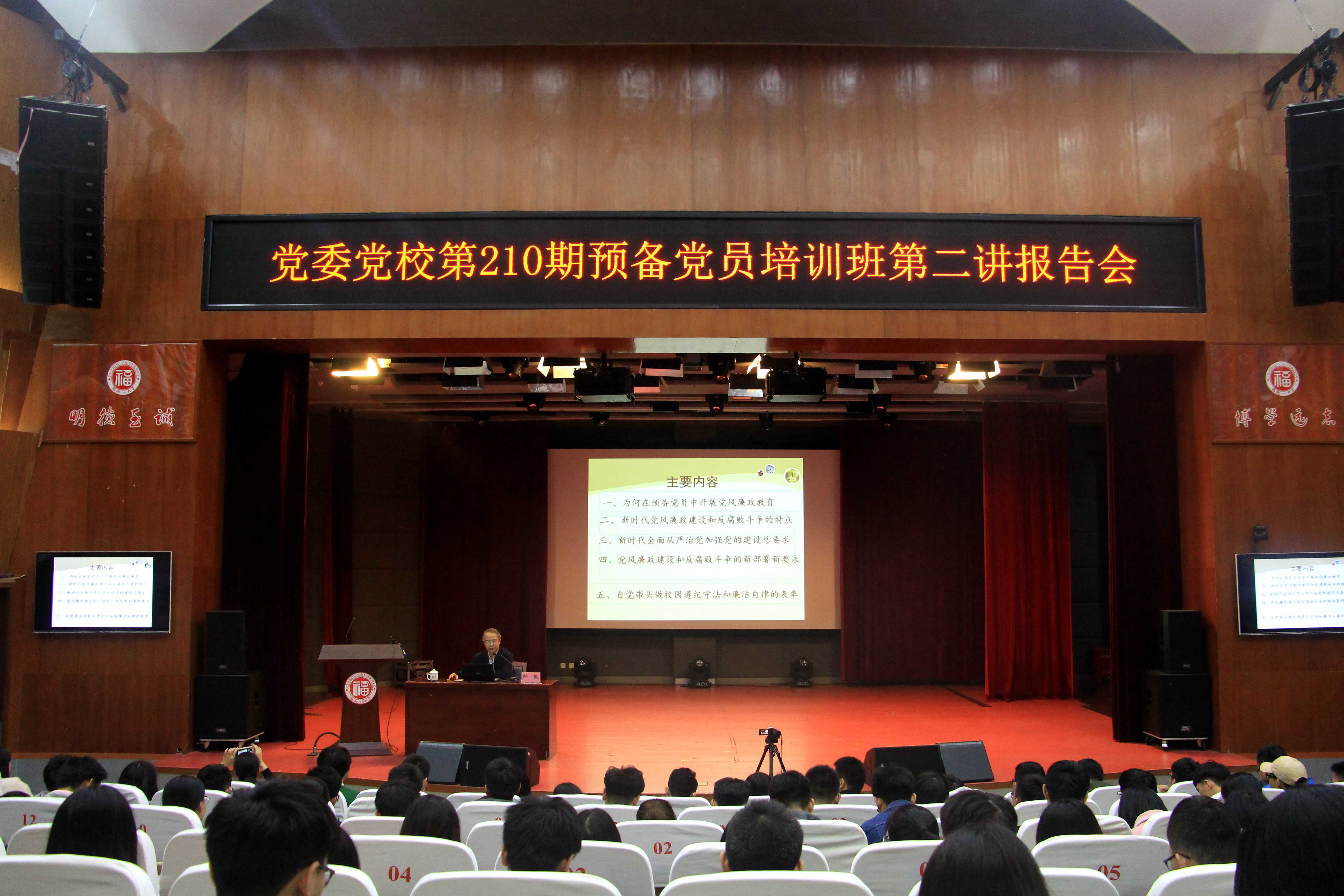 新闻中心讯/11月22日晚,福州大学党委党校第210期预备党员培训班第二讲在图书馆博学厅举行。校纪委书记邹毅为学员们上题为《以十九大精神为指导 深入推进党风廉政建设和反腐败斗争》的专题党课。预备党员培训班836名学员聆听了党课。