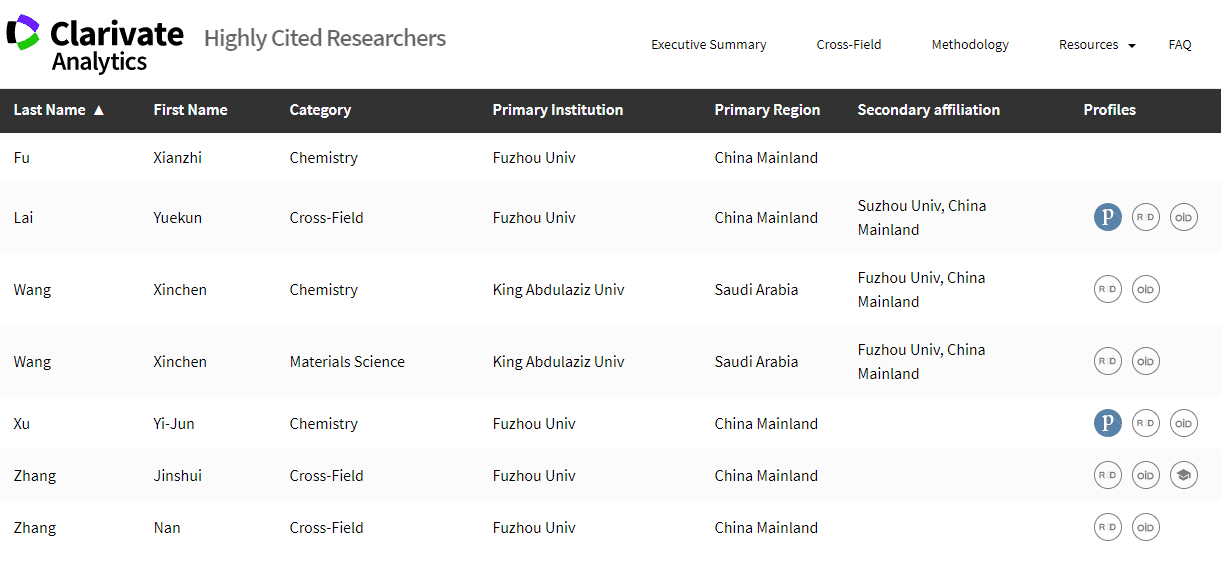 新闻中心讯/11月27日,科睿唯安发布了其2018年度“高被引科学家”名单,这也是该名单连续第五年发布。福州大学共有6位教师(7人次)入选该名单,位居省内高校第一。付贤智院士、王心晨教授、徐艺军教授入选化学领域榜单,王心晨教授还入选了材料科学领域榜单,赖跃坤教授、张金水教授、张楠博士入选跨学科领域榜单。