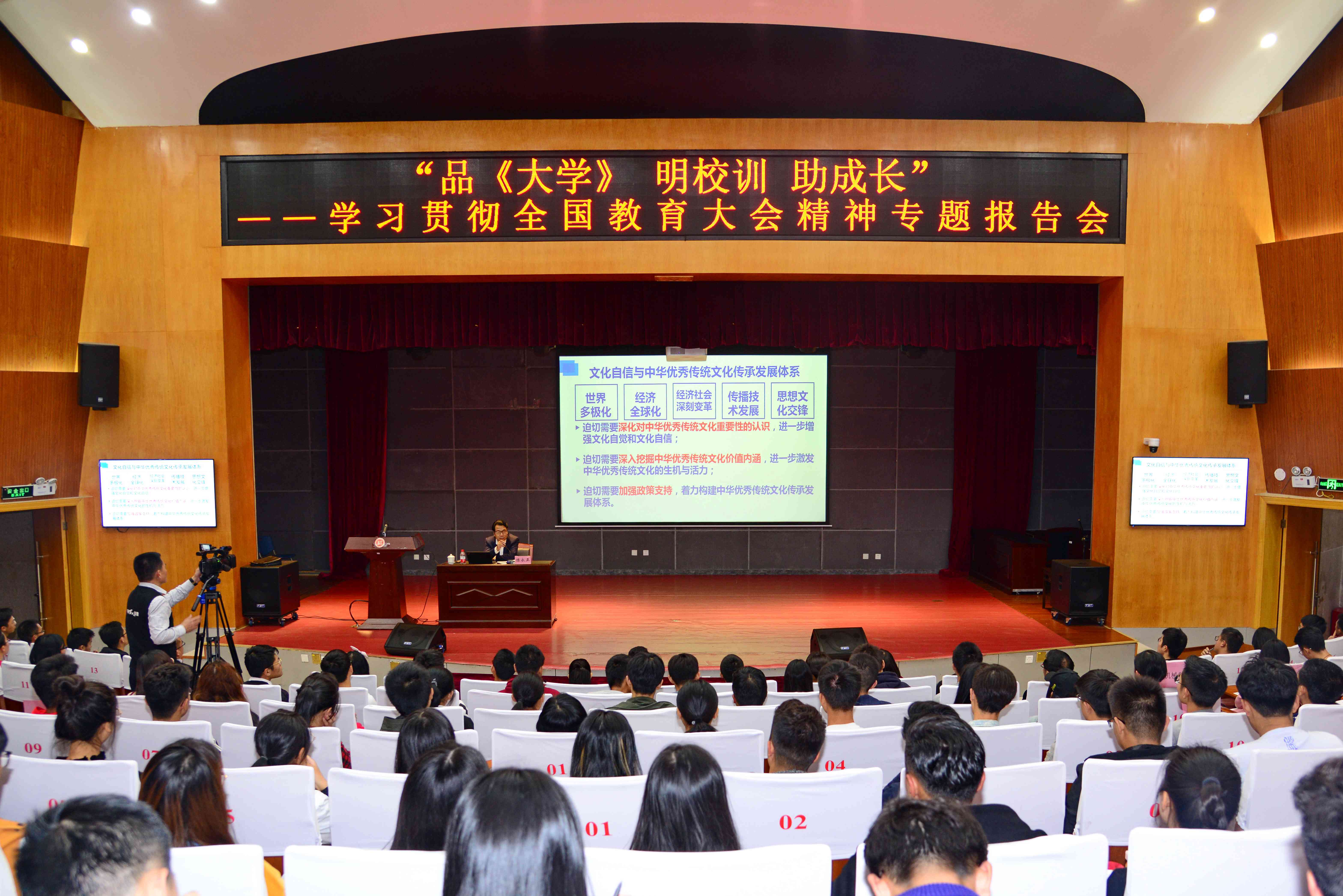 他指出,国学乃中华优秀传统文化的精髓,并对国学的内涵、分类、当代价值、重要意义,尤其是对大学生成长成才的重要意义进行了深刻的阐述。他结合自己的见解和思考,对国学经典著作、四书之首的《大学》进行了深刻的解读。他立足学生、学校实际,结合自身丰富的学识,重点讲述了《大学》的内容及其深刻内涵,对三纲八目进行了生动形象的阐释。他从以立德弘德作为做人之本、以家国情怀作为立业之魂、以科学精神作为求学之基、以胸怀天下作为成才之志论述了《大学》对当代大学生的启示。