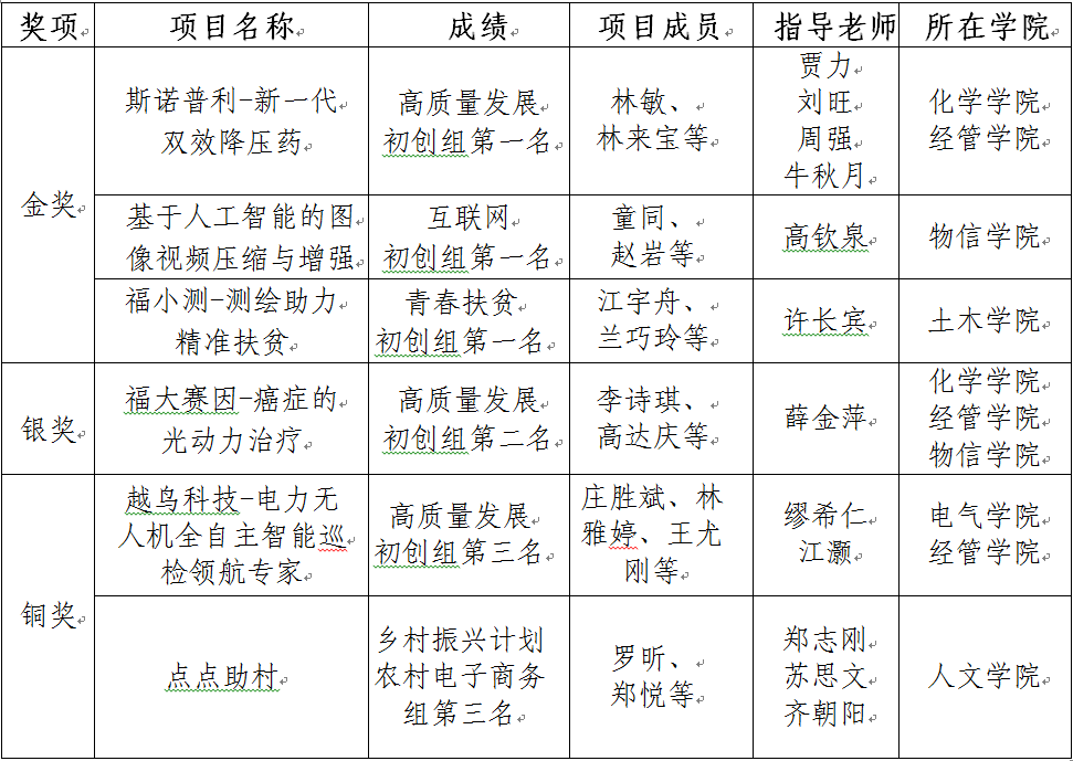 新闻中心讯/11 月 30 日,2018 年第五届“创青春”福建省青年创新创业大赛在漳州落下帷幕。我校共有9个项目晋级决赛,并获得3金1银2铜(面向大陆青年共设立9金),取得我校在该项赛事中的历史最好成绩,在各参赛地市及高校中均排名第一。