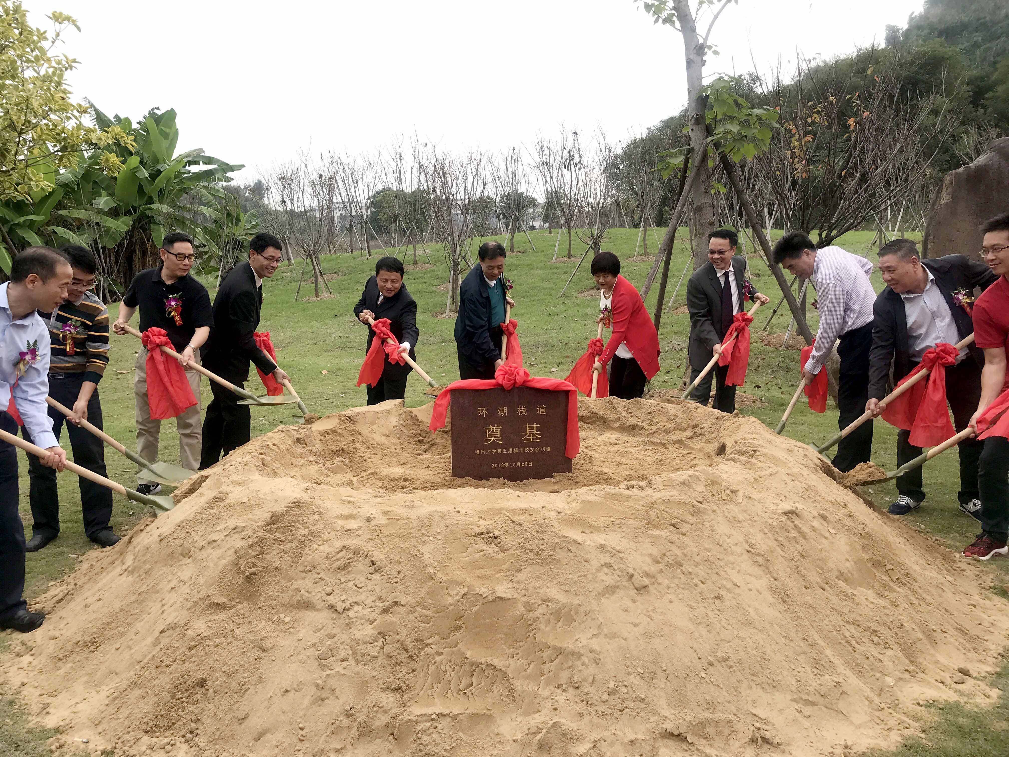 张星副校长发表致辞,他对福州校友会给予母校发展的支持表示衷心感谢,对福州校友不忘母校培养,报效母校的善举表达了诚挚的谢意。他希望福州校友会和广大校友们一如既往地关心支持母校的发展,携起手来,抢抓教育改革的机遇,同舟共济,共同开创福州大学和校友更美好的明天。捐建开工仪式后,领导、嘉宾代表为环湖栈道举行了奠基仪式。
