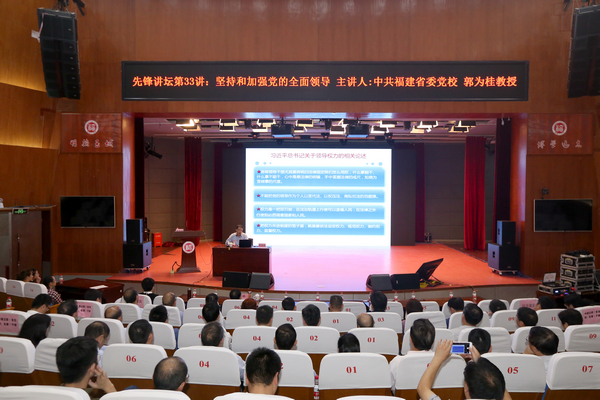 新闻中心讯/10月11日下午,福州大学党委党校第207期教工党支部书记培训班、208期中层干部学习贯彻习近平新时代中国特色社会主义思想专题研讨班、209期辅导员素质能力提升培训班第二讲报告会在图书馆博学厅举行。福建省委党校党建教研部主任郭为桂教授应邀作了题为“坚持和加强党的全面领导”的专题报告。福州大学党委副书记林生以及全校中层干部、教工党支部书记、学生政工干部等共计500余人参加了报告会。