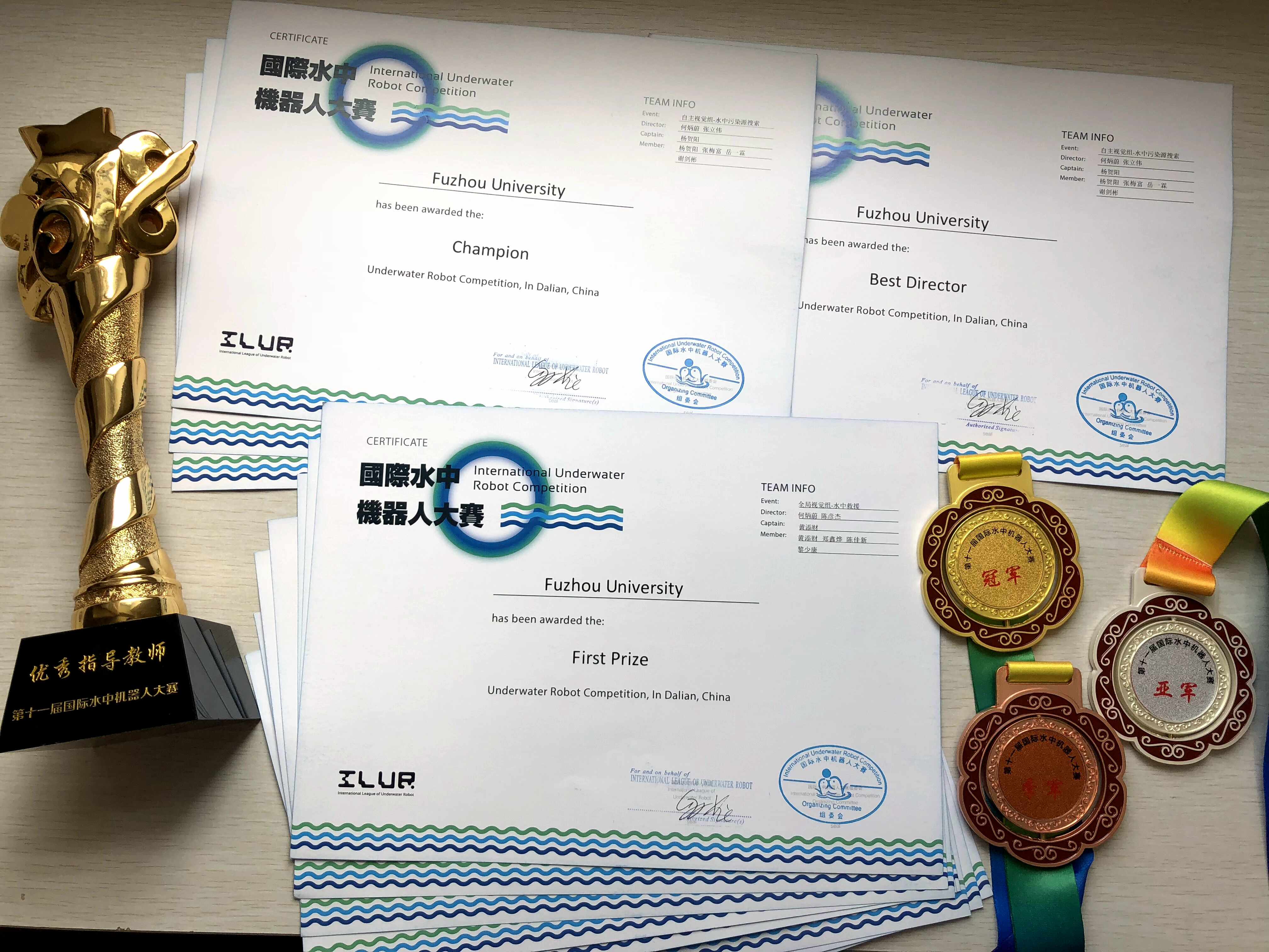 其中何炳蔚教授和张立伟副教授指导的杨贺阳、张梅富、岳一霖和谢剑彬四位本科生获得大赛 “水中污染源搜索”科目的冠军。由张立伟副教授和林立雄博士指导的李欢、庄彬荣、蔡坤彬、汪泽玮和谢洁瑜五位本科生获得大赛“港口侦查”科目的亚军。由何炳蔚教授和陈彦杰博士指导的黄添财、郑烨鑫、陈佳新和黎少康四位本科生获得大赛全局视觉组“水中救援”科目的季军。