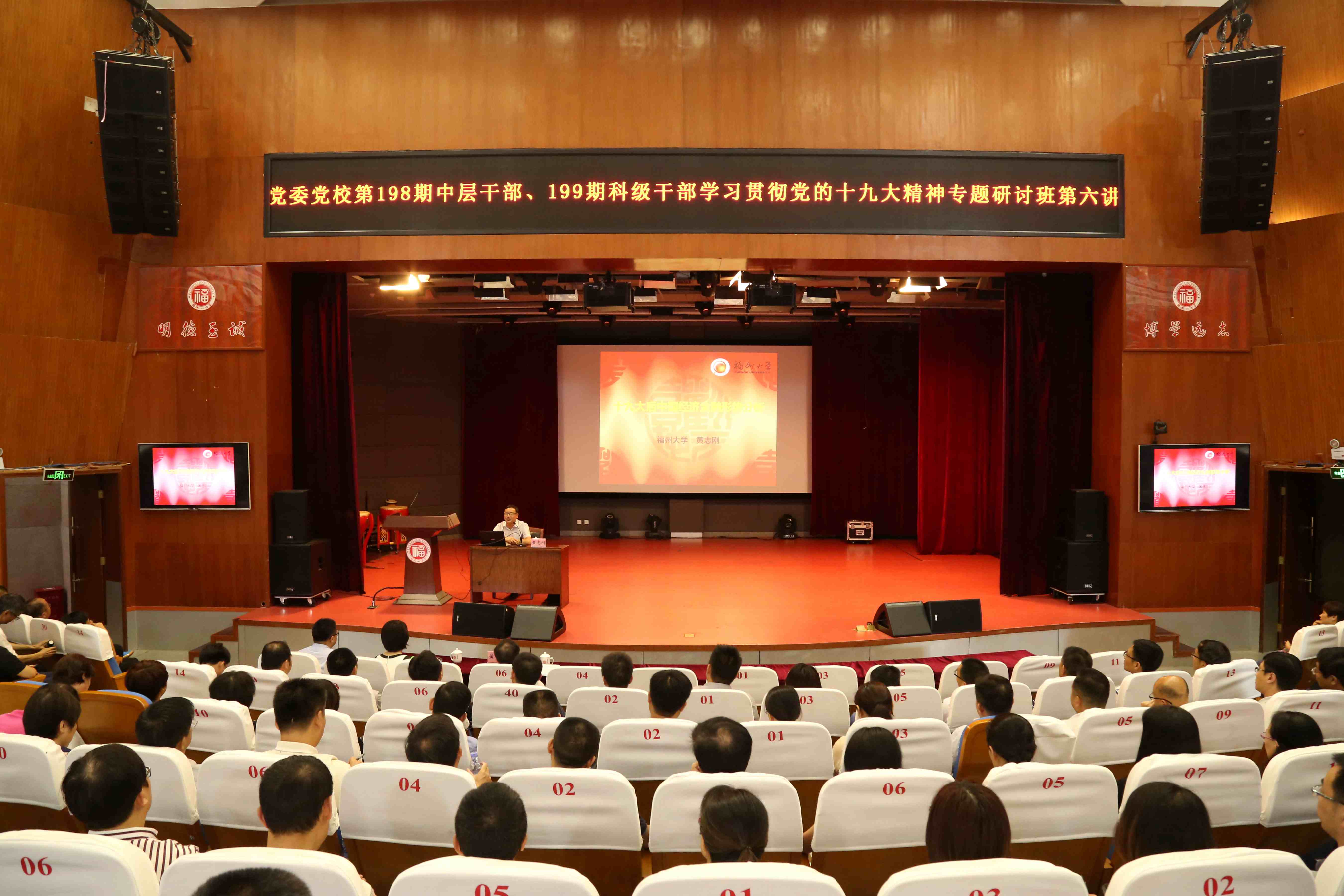 新闻中心讯/6月7日下午,校党委党校第198期中层干部、第199期科级干部学习贯彻党的十九大精神专题研讨班第六讲报告会顺利举办。校党委常委、副校长黄志刚教授出席本次会议,作了主题为《十九大后中国经济金融形势分析》的专题报告,研讨班全体学员参加本次报告会,“学习新思想,同上一堂课”,进一步推进习近平新时代中国特色社会主义思想深入人心。