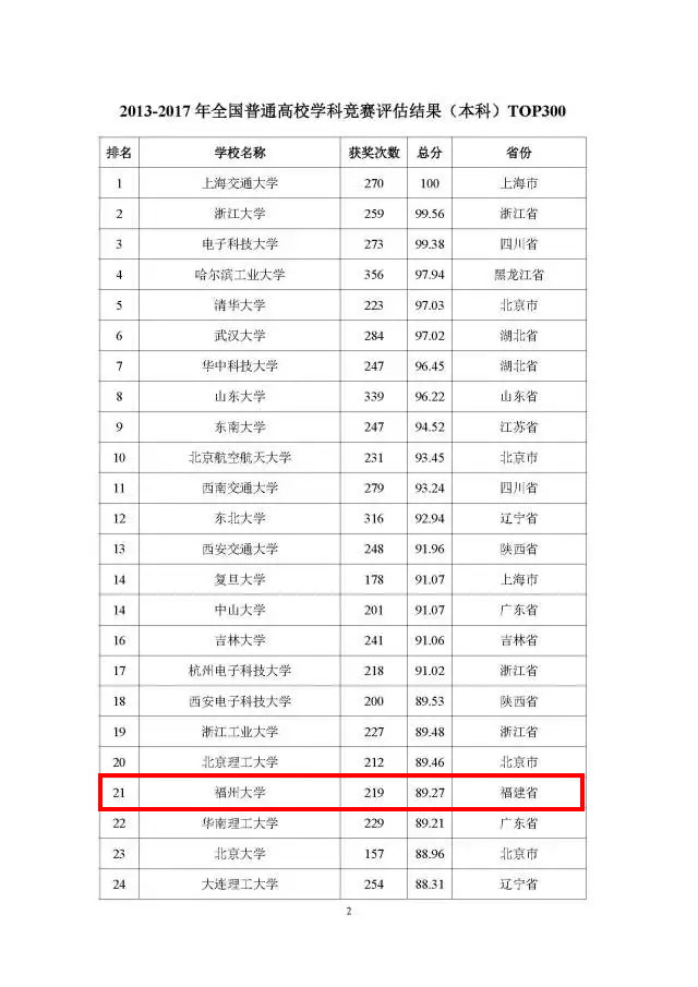 新闻中心讯/2月2日,中国高等教育学会《高校竞赛评估与管理体系研究》专家工作组在北京召开“中国高校创新人才培养暨学科竞赛评估结果”新闻发布会,正式发布2013—2017年中国高校创新人才培养暨学科竞赛评估结果和《中国高校创新人才培养暨学科竞赛白皮书(2012—2017)》。在公布的2013-2017年全国普通高校竞赛评估结果(本科)中,福州大学名列全国第21名,在全国地方高校中名列第3名;同时在公布的2017年全国普通高校竞赛评估结果(本科)中福州大学名列全国第11名。