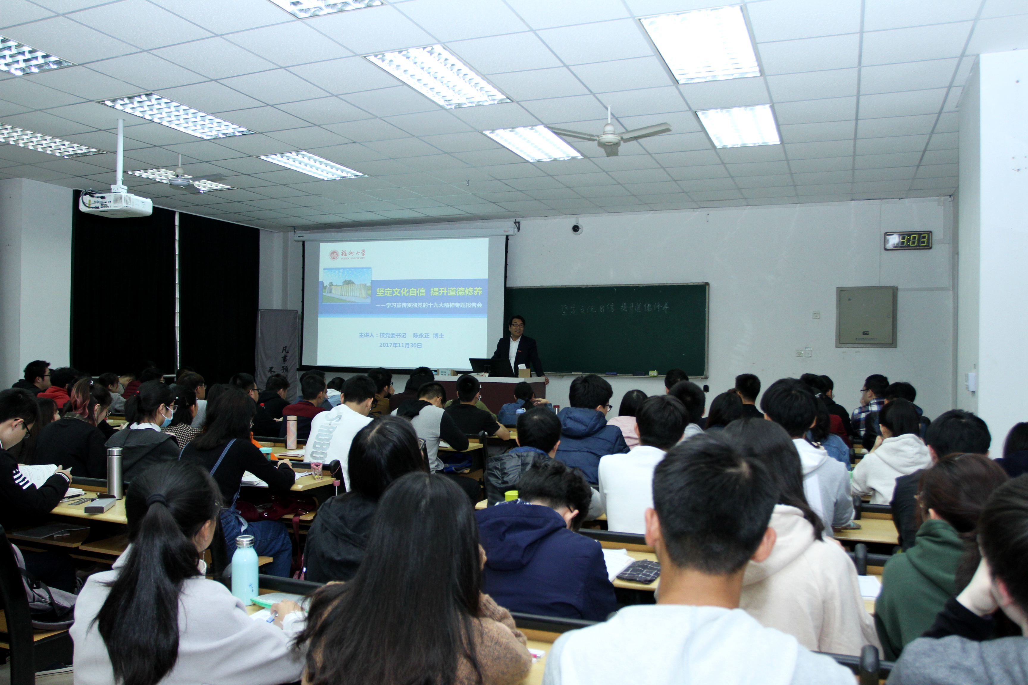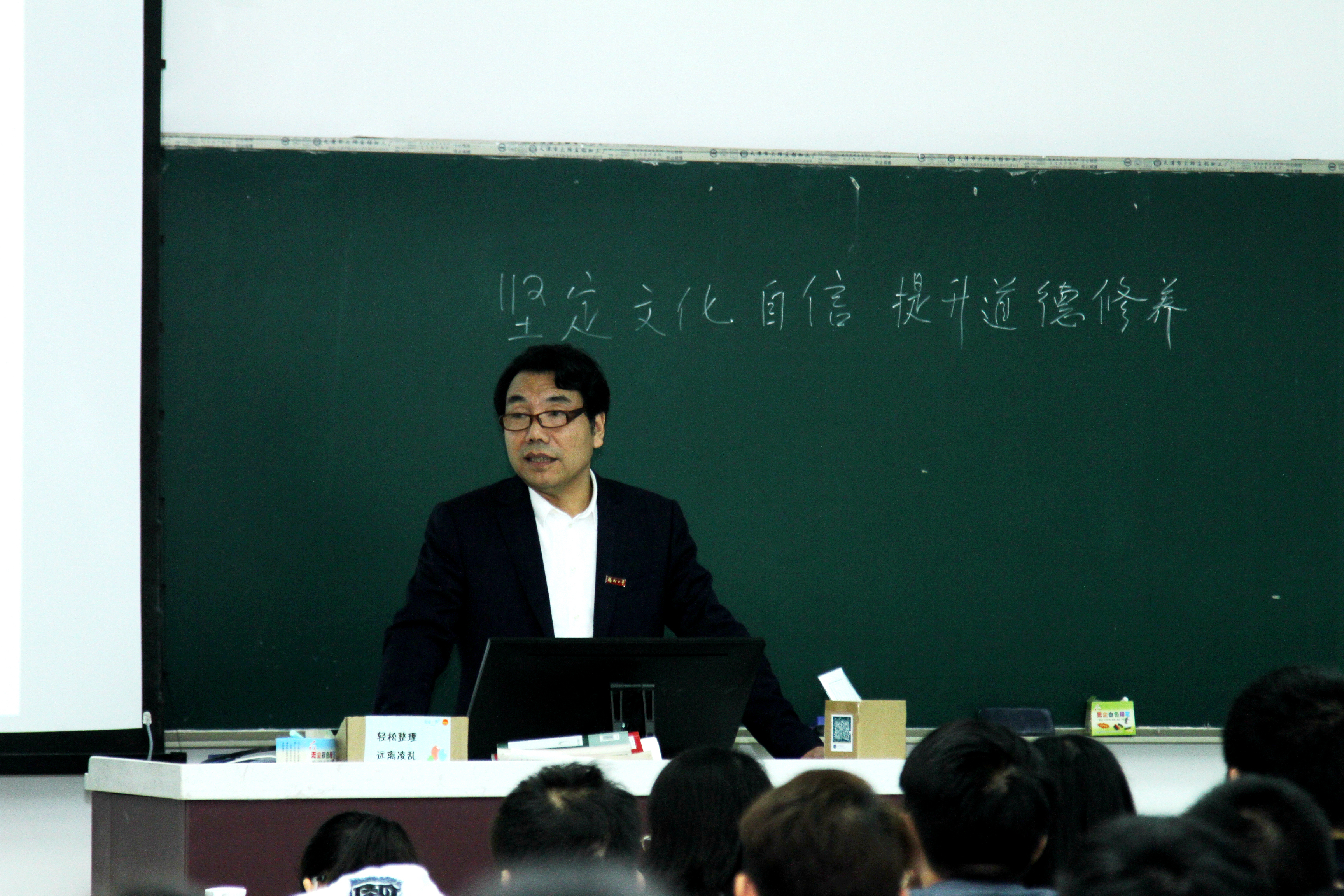 新闻中心讯/“什么是文化自信?”“为什么要增强文化自信?”“依靠什么增强文化自信?”11月30日下午,教学楼西1-202座无虚席,校党委陈永正书记走上讲台,为大学生上了一堂题为《坚定文化自信,提升道德修养》的思政课。