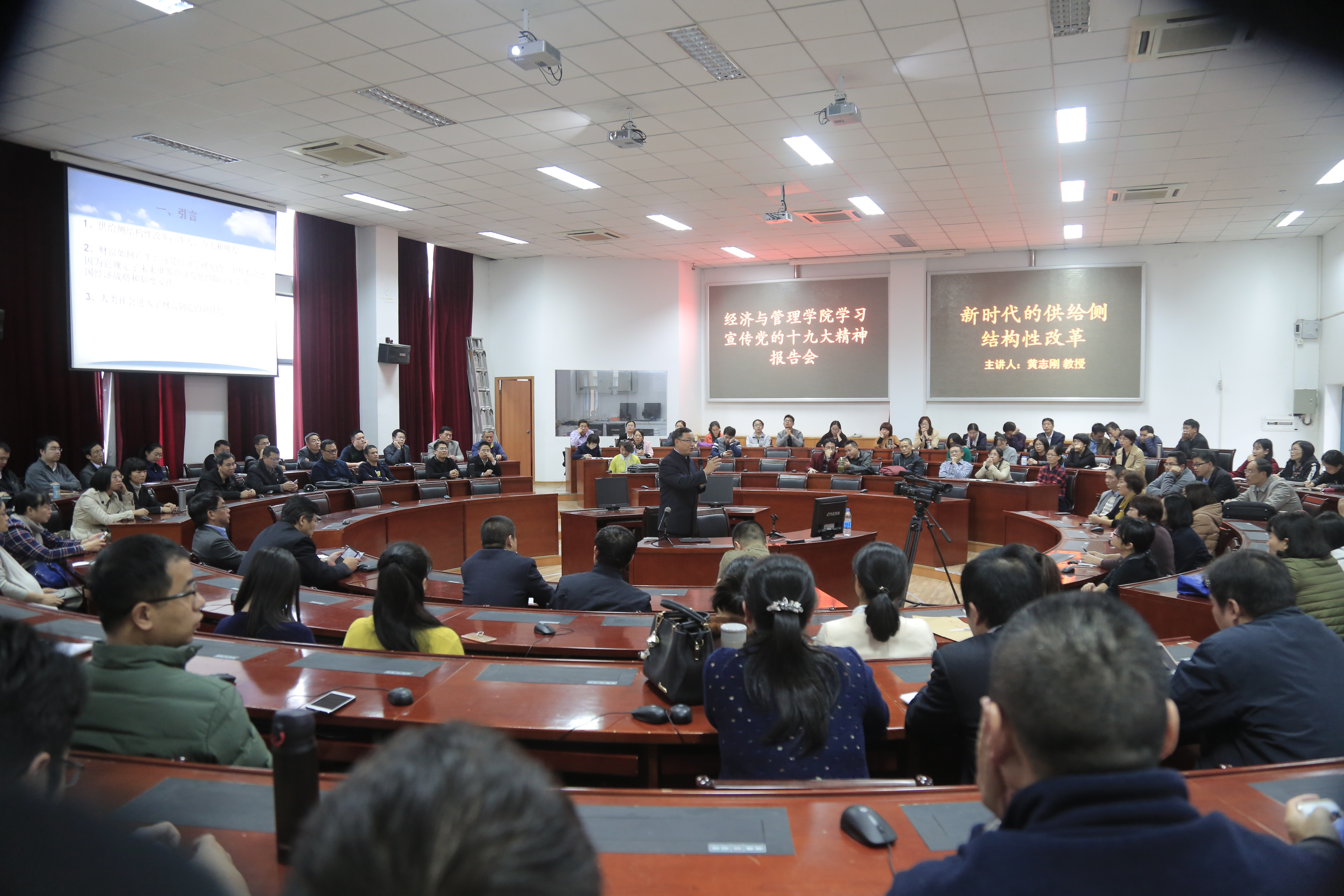 新闻中心讯/11月30日下午,经济与管理学院学习党的十九大精神宣讲报告会在经管中楼418会议室召开。黄志刚副校长为经济与管理学院全体教工党员作了题为《新时代的供给侧结构性改革》的专题宣讲报告。经济与管理学院全体院领导和全院教职工党员参加了报告会。