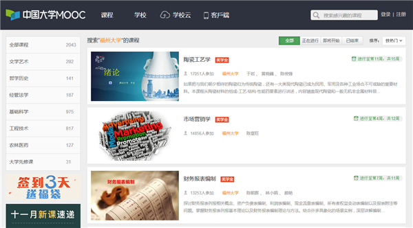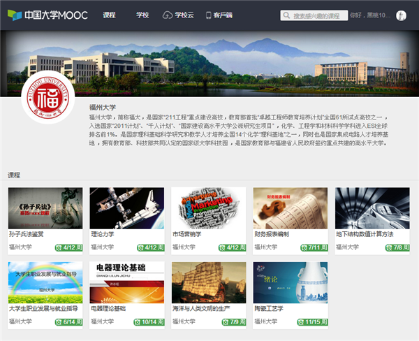 2015年福州大学在全省率先开始探索慕课(MOOC)课程建设,首批立项建设26门慕课(MOOC)课程,2016年又立项建设6门创业类慕课(MOOC)课程。2016年9月,福州大学13门慕课(MOOC)课程获得2016年福建省精品在线开放课程立项,立项数居全省高校第二(第一为厦门大学);10月,9门课程在爱课程网上线应用;10月底,《陶瓷工艺学》(材料科学与工程学院于岩教授)、《市场营销学》(经济与管理学院陈章旺教授)、《财务报表编制》(经济与管理学院陈朝晖副教授)等三门课程的选课人数均超过13000人;到12月底,将有累计近20门课程将完成课程制作并陆续上线应用。