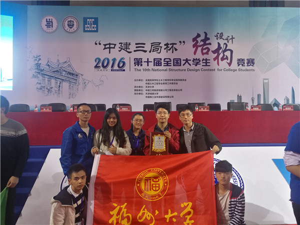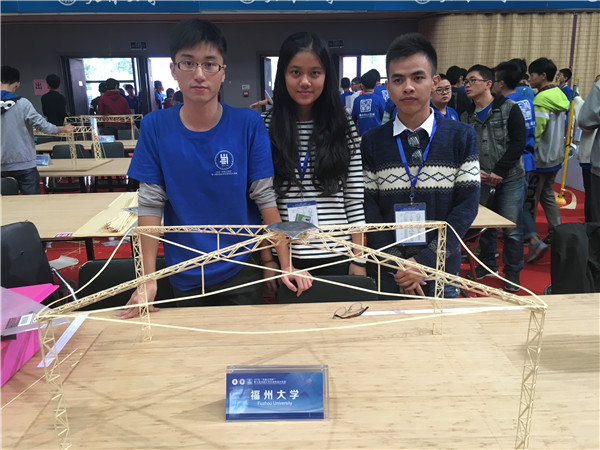 新闻中心讯/第十届全国大学生结构设计竞赛于10月12-16日在天津大学体育馆隆重举行。在土木工程学院指导老师陈力波、领队老师许美玲的带领下,由土木工程专业2014级林锦德、廖传杭、范延静同学组成的福州大学代表队在第十届全国大学生结构设计竞赛中荣获二等奖。