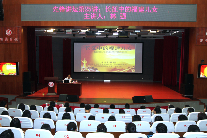 新闻中心讯/10月31日晚,福州大学先锋讲坛第25讲暨福州大学党委党校第179期发展对象培训班第六讲在图书馆博学厅举行,省委党史研究室原副主任、正厅级巡视员、福建省直机关党工委讲师团特聘教授林强应邀为我校师生作了题为《长征中的福建儿女》的专题报告。报告会由校党委党校常务副校长占永琼主持,全校600余名师生到场聆听。
