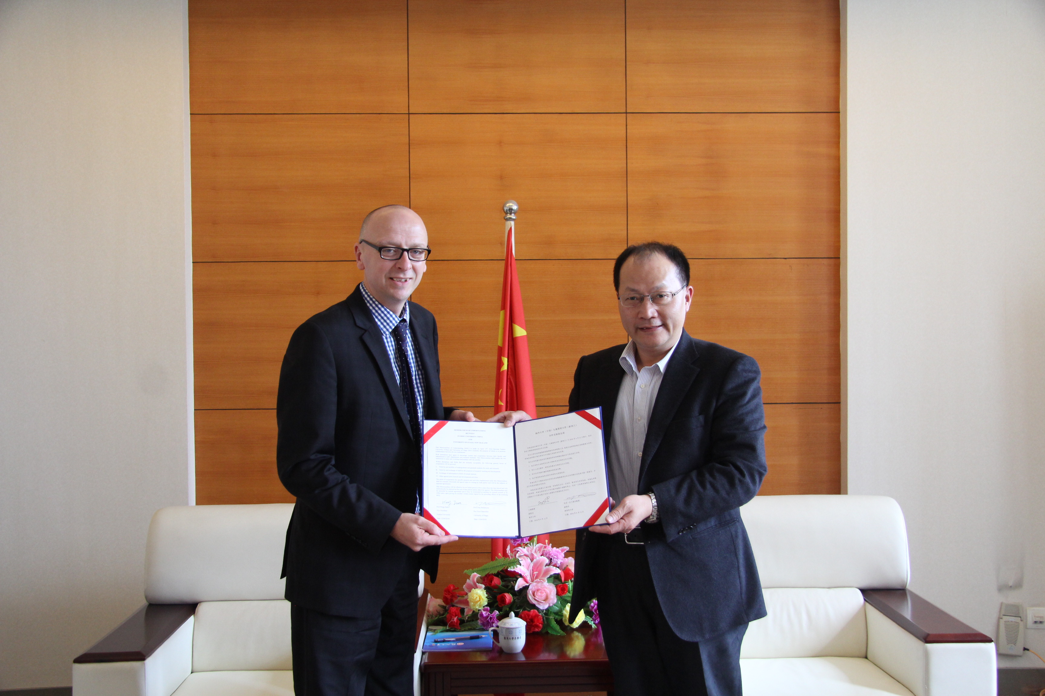 王健副校长向客人的到访表示欢迎,并介绍了福大基本情况。双方就以外国语学院为起点,以点带面展开两校合作达成共识。托尼·巴兰泰因教授表达了希望福州大学也能到奥塔哥大学进行访问交流的愿望。双方代表各自学校签署了两校的合作备忘录。随后托尼·巴兰泰因教授前往外国语学院,与学院就具体的合作模式进行进一步探讨和沟通。