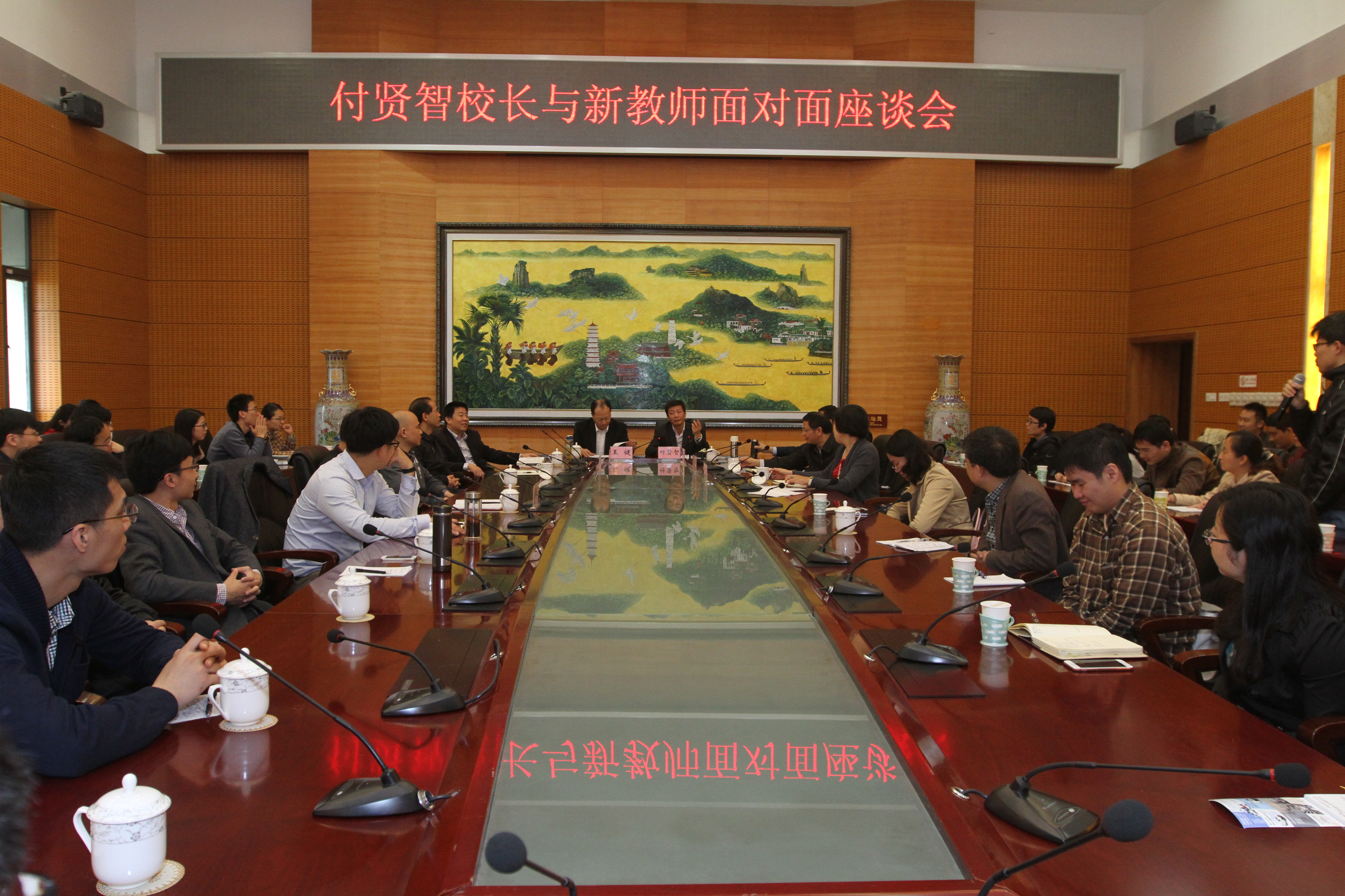新闻中心讯/4月12日上午,付贤智校长来到行政南楼123会议室与2015年新上岗的89名教师面对面交流座谈,付校长勉励青年教师要热爱教师事业,努力工作,积极作为,勤于学习,善于思考,勇于创新,尽快融入到学校发展事业中,为学校的持续快速协调发展作出积极贡献。王健副校长主持座谈会。教务处、人事处、科技处、基建资产处、后勤处等部门负责人出席了会议。