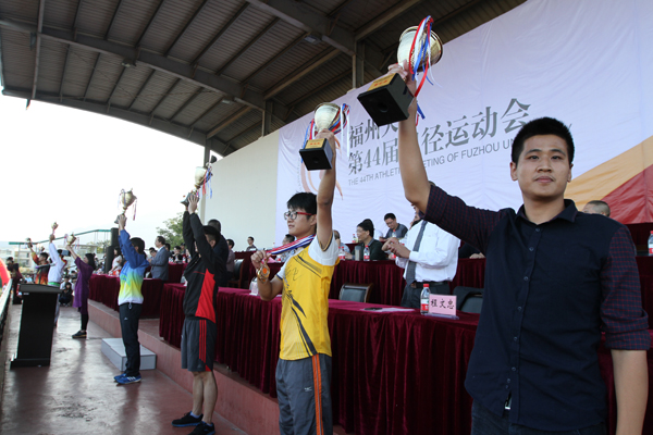 闭幕式表彰了在福州大学首届“和谐杯”教职工团体竞赛、2014-2015学年学生群体竞赛“振奋杯”团体总分评比、体育道德风尚评比以及此次田径运动会比赛中表现突出的先进集体和个人。“和谐杯”由至诚学院、直属单位、建筑学院等8个团体获得;“振奋杯”由土木学院、经管学院、电气学院等8个学院获得;物信学院、石化学院、经管学院等10个学院以及72名同学、142名裁判获得体育道德风尚评比奖。