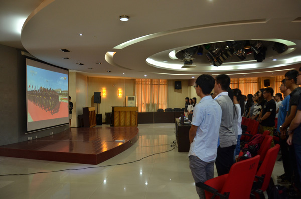 在观看直播过程中,福大学子被现场的气势和场面深深震撼了,他们为祖国的强大感到无比的骄傲和自豪,整个过程一直洋溢着一种强烈的民族自豪感。有几个细节特别值得一提,在李克强总理宣布“开始”的时候,现场观众自发地全体起立,戴帽的同学也主动脱下帽子,用最崇敬的态度,等待升起五星红旗。另外,在习主席坐红旗车出场、老兵出场、70造型的飞机盘旋而过的时候,现场观众都自发地热烈鼓掌。