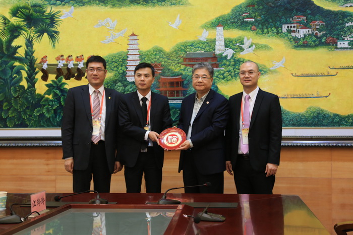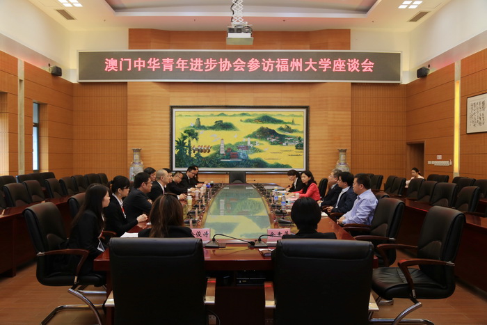 新闻中心讯/11月25日上午,澳门中华青年进步协会会长林英培先生率团访问福大并在福大举办“庆祝澳门回归十五周年·走进澳门”图片展。福大党委陈少平副书记在行政南楼123会议室接待了访问团一行。党办、校办、统战部、宣传部、对外合作交流处相关负责人出席了座谈会。座谈会上,陈少平副书记代表学校对林英培会长一行表示真诚和热烈的欢迎,感谢他们为福州大学送来一个了解澳门以及与澳门青年互动学习和交流的良好机会。会上双方还互赠了纪念品。
