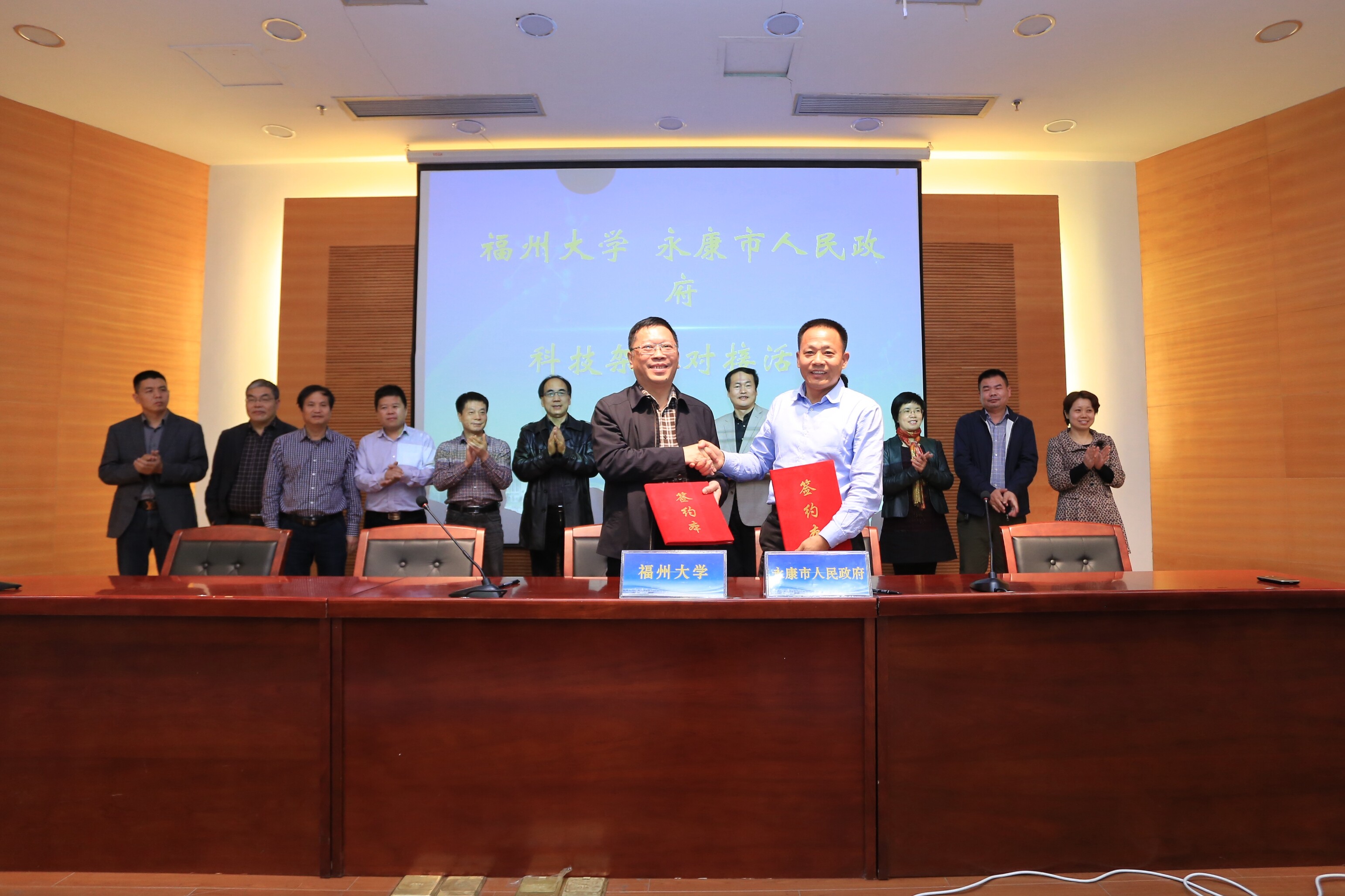 新闻中心讯/11月19日下午,福大与浙江永康市人民政府在行政北楼举行“科技架桥”对接活动暨“福州大学•永康市人民政府科技•人才合作”签约仪式。陈国龙副校长、永康市吕群勇副市长出席活动并致辞。科技与产业发展中心常务副主任周训胜介绍了福大科技发展情况。签约仪式上,陈国龙副校长与吕群勇副市长代表签订了双方“科技•人才合作”协议。随后,福大相关部门、学院领导、专家教授与永康市相关部门领导及企业家们分组进行了交流,并参观了相关学院实验平台。