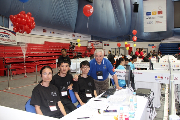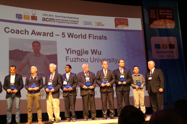 福大Hallucination代表队(由2013级计算机应用技术专业研究生卢清、2013级应用数学专业研究生钟亮和2010级软件工程专业本科生杨楠三位同学组成)在总教练吴英杰老师带领的教练团队指导下,经与国际知名高校代表队的激烈角逐,最终在122支强劲竞争对手中位居并列第19名。这是福大第五次晋级ACM-ICPC全球总决赛,也是福建省晋级本届全球总决赛的唯一高校。同时,由于福大已晋级ACM-ICPC全球总决赛五次,ACM-ICPC总部还授予福大ACM代表队总教练吴英杰老师“教练奖”荣誉称号!(教务处 陈坚民)