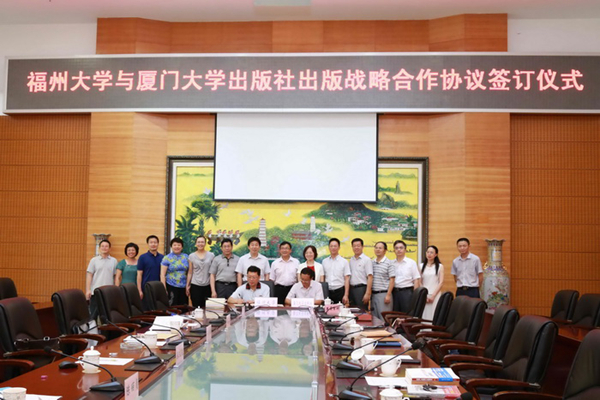 新闻中心讯/6月12日上午,福州大学与厦门大学出版社出版战略合作协议签订仪式在福州大学旗山校区行政南楼123会议室举行。福大陈国龙副校长、黄志刚校长助理、厦门大学出版社蒋东明社长一行6人、福大教务处、研究生院、科技处、社科处、学生处、经济与管理学院、法学院、体育教学部等有关负责人及教师参加了签约仪式。签约仪式由黄志刚校长助理主持。
