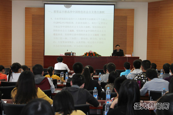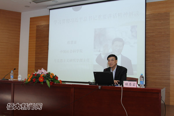 新闻中心讯/10月27日下午,福大在行政北楼西325会议室举办了学习贯彻习近平总书记系列重要讲话精神辅导报告会。我国著名经济学家、理论家、中国社会科学院程恩富教授应邀到会为我校师生作题为《改革开放向何处去——解读习近平一系列重要讲话精神》的报告会。参加报告会的有各学院党委副书记、团委书记、部分学院师生代表、机关有关部门的干部约200人,会议由校党委宣传部部长林志凯主持。