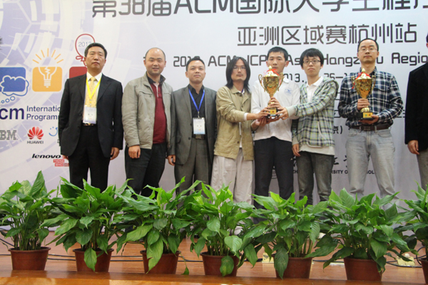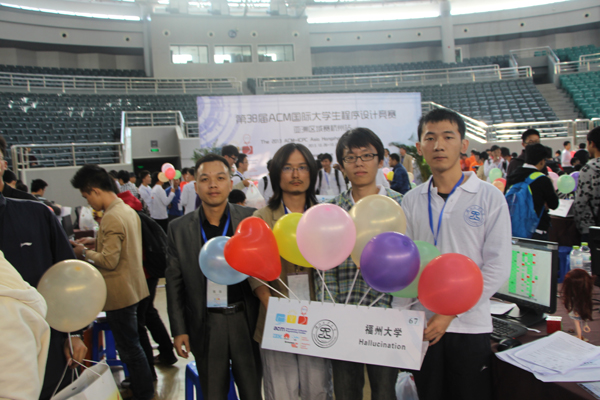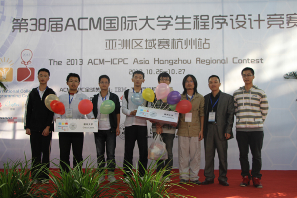 新闻中心讯/福州大学 ACM代表队在总教练吴英杰老师带领的教练团队指导下,由数计学院卢清、钟亮、杨楠三位同学组成的Hallucination队在与来自上海交通大学、香港中文大学、复旦大学、吉林大学、清华大学、浙江大学、朝鲜理工大学、蒙古国立大学等亚洲3个国家97所大学153支队伍的激烈角逐中脱颖而出,突破性地获得第38届ACM国际大学生程序设计竞赛亚洲区预选赛(杭州)季军,这是福州大学代表队首次捧得该项赛事的奖杯。该代表队将晋级2014年在俄罗斯叶卡捷琳堡乌拉尔联邦大学承办的第38届ACM国际大学生程序设计竞赛全球总决赛。这是福州大学ACM代表队第5次获得该项赛事全球总决赛的参赛资格。