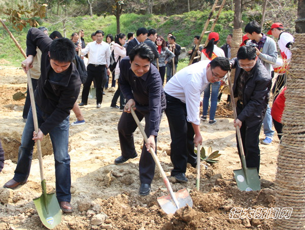 新闻中心讯/在2013年植树节来临之际,为响应学校建设“美丽校园”的号召,倡导广大师生积极参与学校的绿化、美化活动,3月11日中午,福州大学在旗山校区第二田径场南侧开展了今年的义务植树活动。校领导、校部机关干部以及学生代表参加了植树活动。在师生们的共同努力下,第二田径场南侧种上了一片广玉兰,今后将成为学校南侧运动区域的新景观。