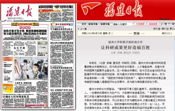 新闻中心讯/近日,《福建日报》等多家媒体,报道福州大学在科技开发、服务地方,以及闽商文化研究等方面的工作亮点,6月10日,《福建日报》在头版以《福州大学积极开展校地合作 让科技成果更好地服务百姓》为题专门报道了福州大学近年来,科技服务社会所取得的优秀成果,充分肯定了福州大学近年来对海西建设的贡献。