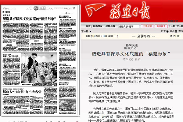 6月11日,《福建日报》第十一版“全景海西”版面“特别关注”栏目,以《闽商文化:塑造具有浓厚文化底蕴的“福建形象”》为题,报道了福州大学闽商文化研究院在开展闽商文化研究和推广等方面,利用文字、影像、数字等多种手段传播中国海洋文明,为提高全民族的海洋意识提供丰富的学理知识。文章以“了解闽商群体,还原闽商文化”、“弘扬海洋文化 打造福建名片”两部分对福州大学弘扬研究闽商文化所做的贡献进行了深入报道。(许晓凤)