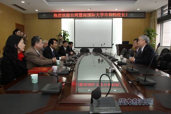 新闻中心讯/3月2日上午,台湾暨南国际大学许和钧校长在福州大学党委陈永正书记、陈少平副书记的陪同下,参观了图书馆、校史馆,详细了解福州大学的发展历史、基本概况,并在图书馆召开座谈会,就两校的建设发展以及合作交流等问题进行了深入交流。会后,许和钧校长一行参观了福州大学旗山校区。党办、校办、对外交流合作处、图书馆、阳光学院等单位的负责同志到场陪同。(张志忠)