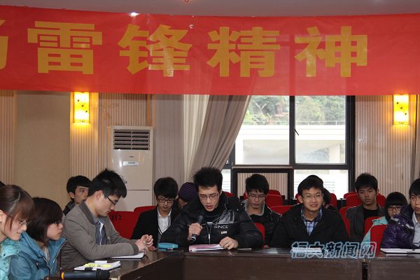 会议首先播放了雷锋先进事迹宣传片和福大青年志愿者服务记录片。随后,学生代表分别结合自己平时的志愿服务、工作学习等方面谈了在新时代如何弘扬雷锋精神的体会。外语学院福建省优秀志愿者董瑜红回忆了自己在特奥会期间和台湾运动员结下的深厚友谊;校红十字会的学生代表分别介绍了红会在校园内外开展的包括防艾宣传、义务献血、手语培训、急救培训在内的各项活动;校青年志愿者协会、志愿者工作部的同学们则分享了他们在支教、扶贫等一系列志愿服务中的感人故事;校学生会常务副主席吴鑫同学代表学生会宣读了学习实践雷锋精神倡议书。福州大学学生处处长程文忠老师、宣传部部长庄莉老师也分别就雷锋精神与同学们交流了自己的感想。